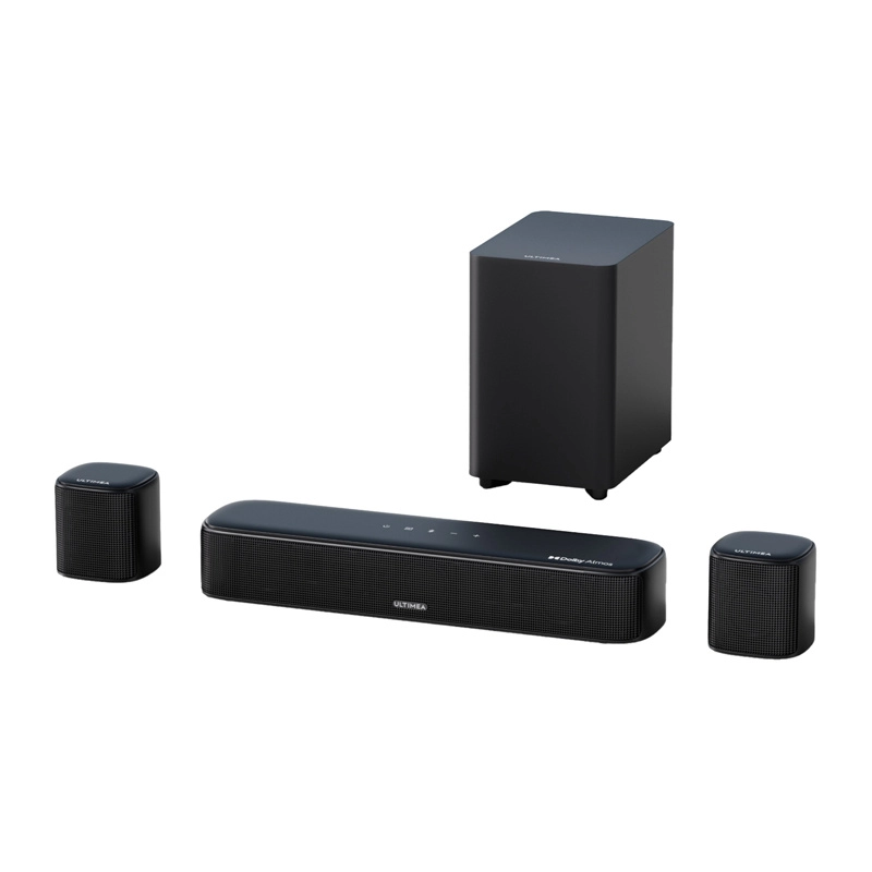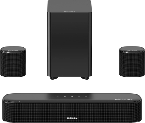 Oplev hjemmebio med Ultimea Aura A50 Pro – et kompakt 5.1-system med seks drivere og kablet subwoofer. Det tilbyder Dolby Atmos, kraftig og kontrolleret bas takket være BassMX2, inddragende surroundlyd med SurroundX2 og tabsfri overff8rsel via HDMI eARC. Styr det hele fra telefonen – du fe5r hurtig opse6tning, klare dialoger og dynamiske effekter til film, musik, sport og spil.