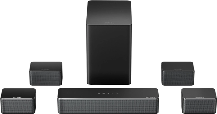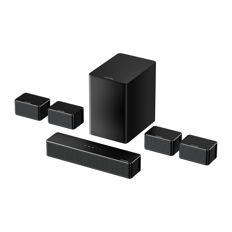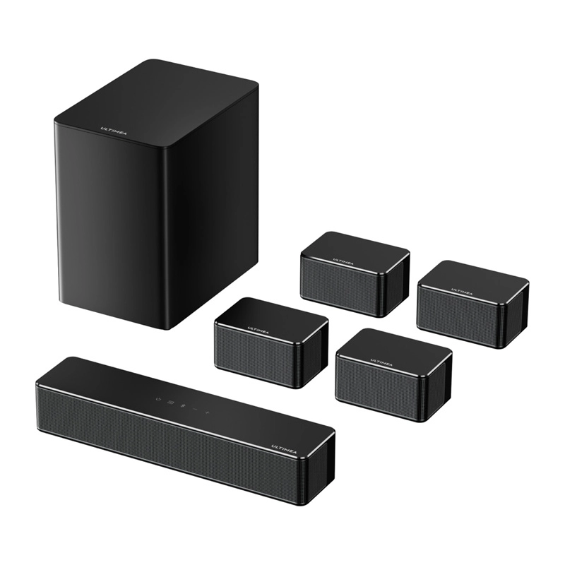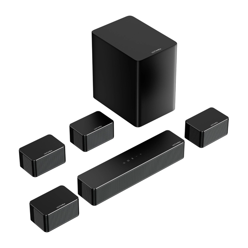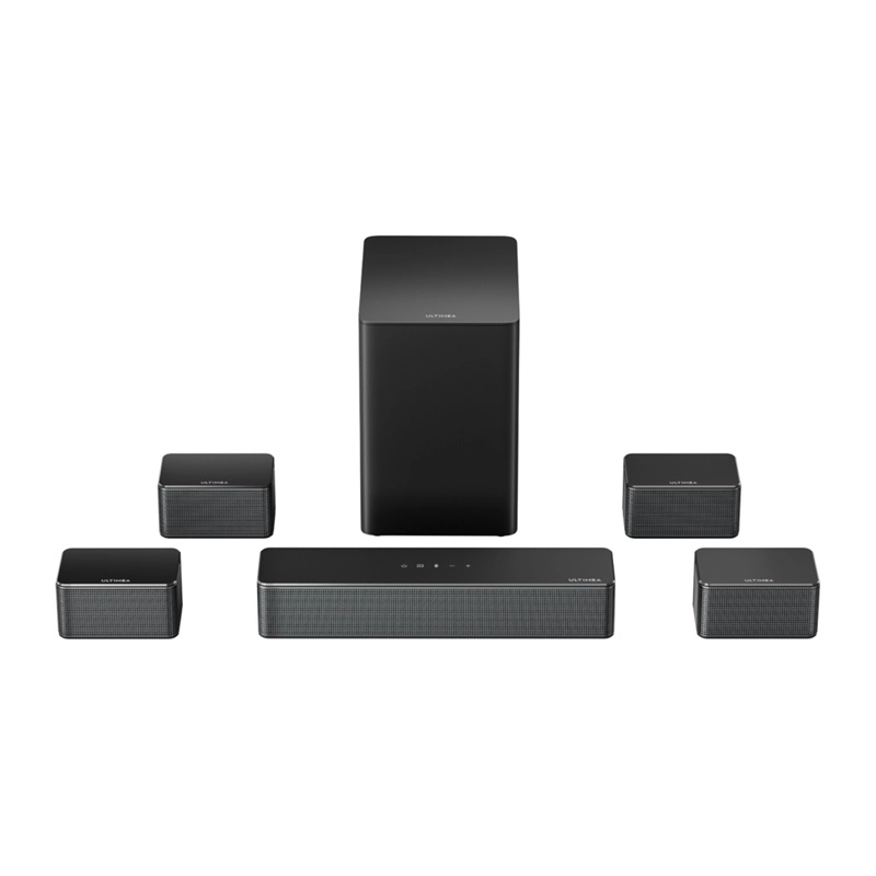 ULTIMEA Poseidon D70 bringer 7.1 surroundlyd med samlet effekt på 410 W til din stue. Kombinationen af fire satellithøjttalere, en central soundbar og en 6,5" trådløs subwoofer skaber et bredt lydbillede med præcis effektlokalisering – perfekt til film, spil og musik. SurroundX™-teknologi og AI-styret behandling fremhæver fine detaljer og giver scenerne autenticitet.