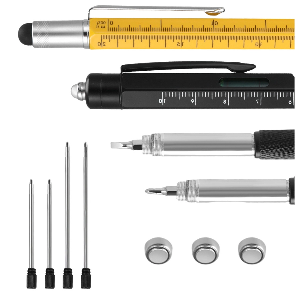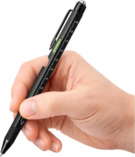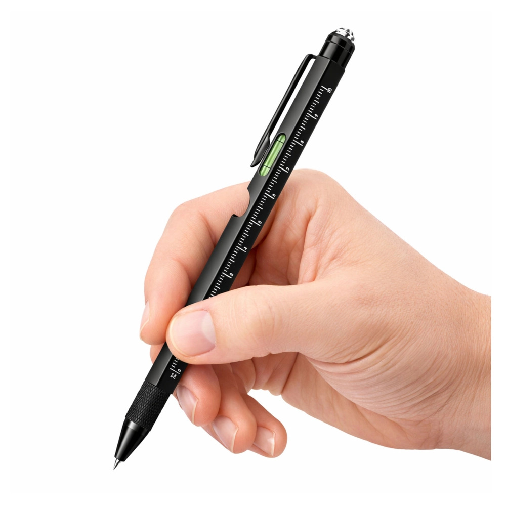 Den sorte pen kombinerer LED-lygte, libelle, lineal, stylus, flaskeåbner, telefonholder og skruetrækkere (flad/Phillips). Ideel til hurtige justeringer, målinger og noter.