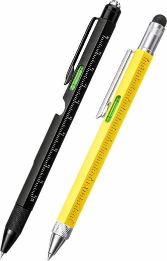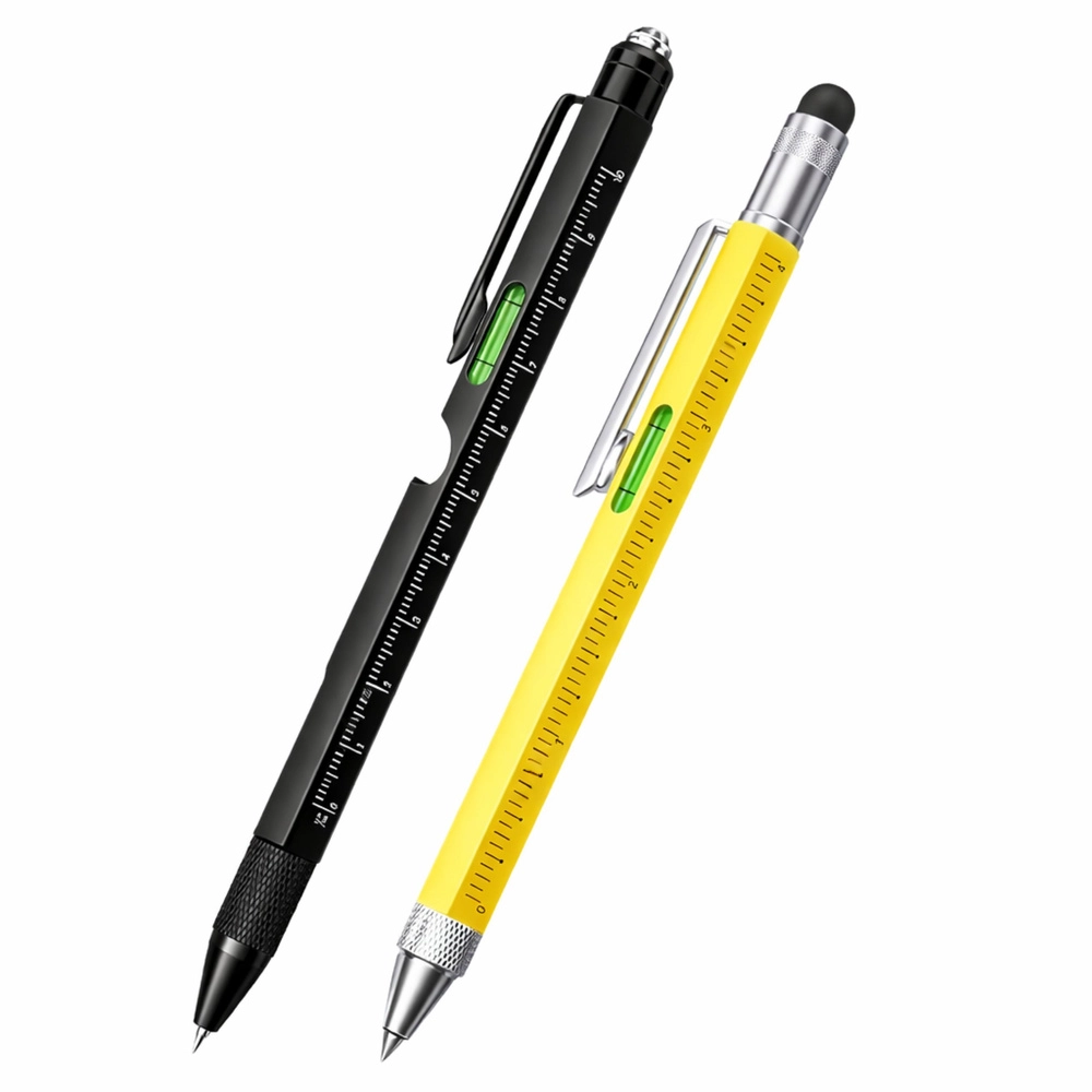Spar plads og tid med et universelt sæt, der kombinerer skrivning, måling og hurtige småreparationer. Den sorte 9-i-1 pen er udstyret med LED-lygte til arbejde under vanskeligere forhold, integreret libelle til justering, påtrykt måleskala, stylus, flaskeåbner, telefonholder og to skruetrækkerbits (flad/Phillips). Den gule pen supplerer de mest anvendte funktioner – stylus, lineal og skruetrækker – i en robust metalkrop med sikkert greb.