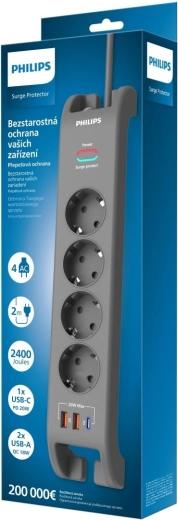 PHILIPS overspændingsliste giver pålidelig beskyttelse af din følsomme elektronik mod overspændinger og spikes i elnettet. Med en kapacitet på 2400 J og MOV-teknologi absorberes overskydende energi, hvilket øger sikkerheden for tilsluttede enheder. De fire stikkontakter suppleres af 3 USB-porte (1× USB‑C, 2× USB‑A) til samtidig opladning af flere enheder.