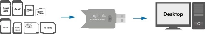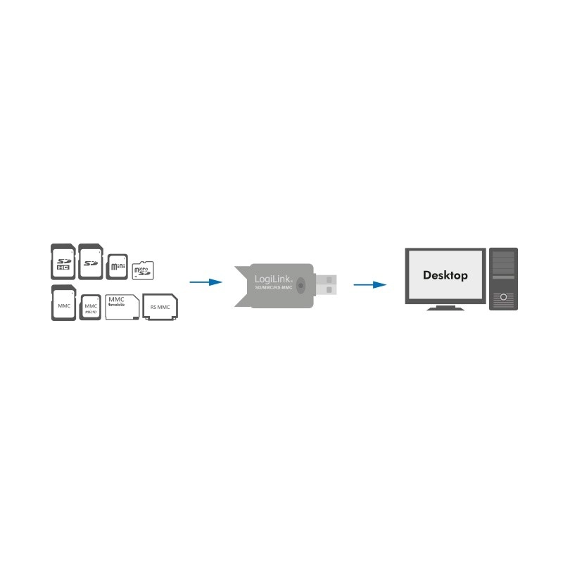 Den kompakte LOGILINK-kortlæser til USB 2.0 muliggør hurtig læsning og skrivning af hukommelseskort SD, MMC og RS‑MMC. Takket være plug‑and‑play fungerer den uden driverinstallation, har LED‑indikering af aktivitet og passer nemt i lommen takket være de miniature mål. Ideel til hurtig overførsel af fotos, videoer og dokumenter mellem kort og computer.