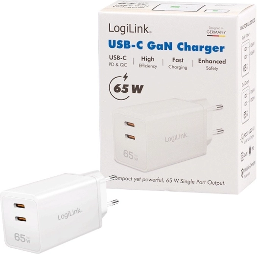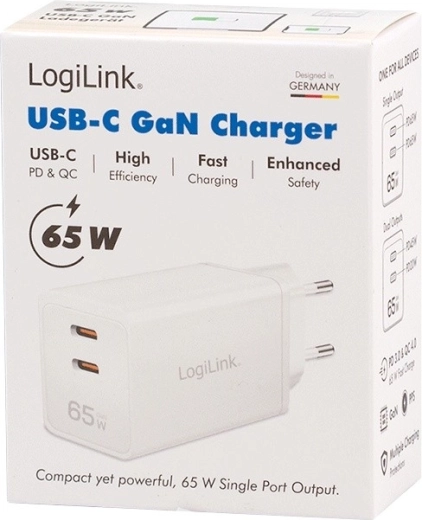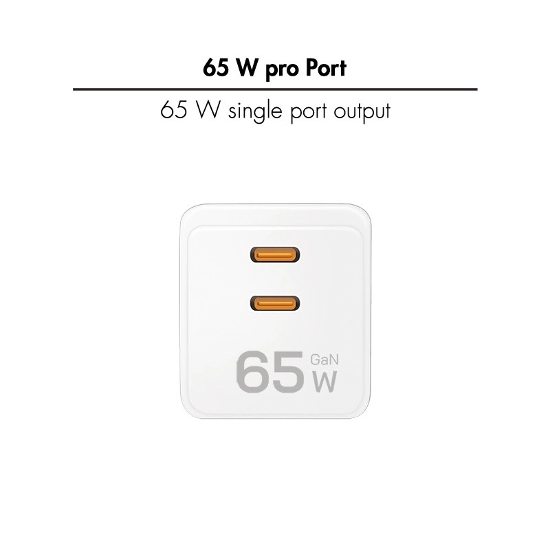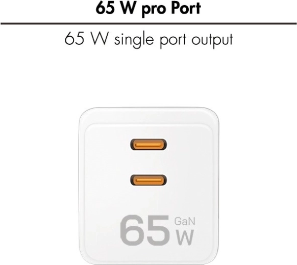 Denne hvide vægoplader med avanceret GaN-teknologi tilbyder højere effektivitet, mindre størrelse og lavere varmeudvikling. Med en samlet effekt på 65 W driver den nemt moderne enheder, herunder smartphones, tablets og udvalgte bærbare med USB‑C.