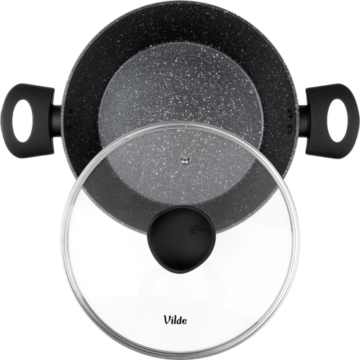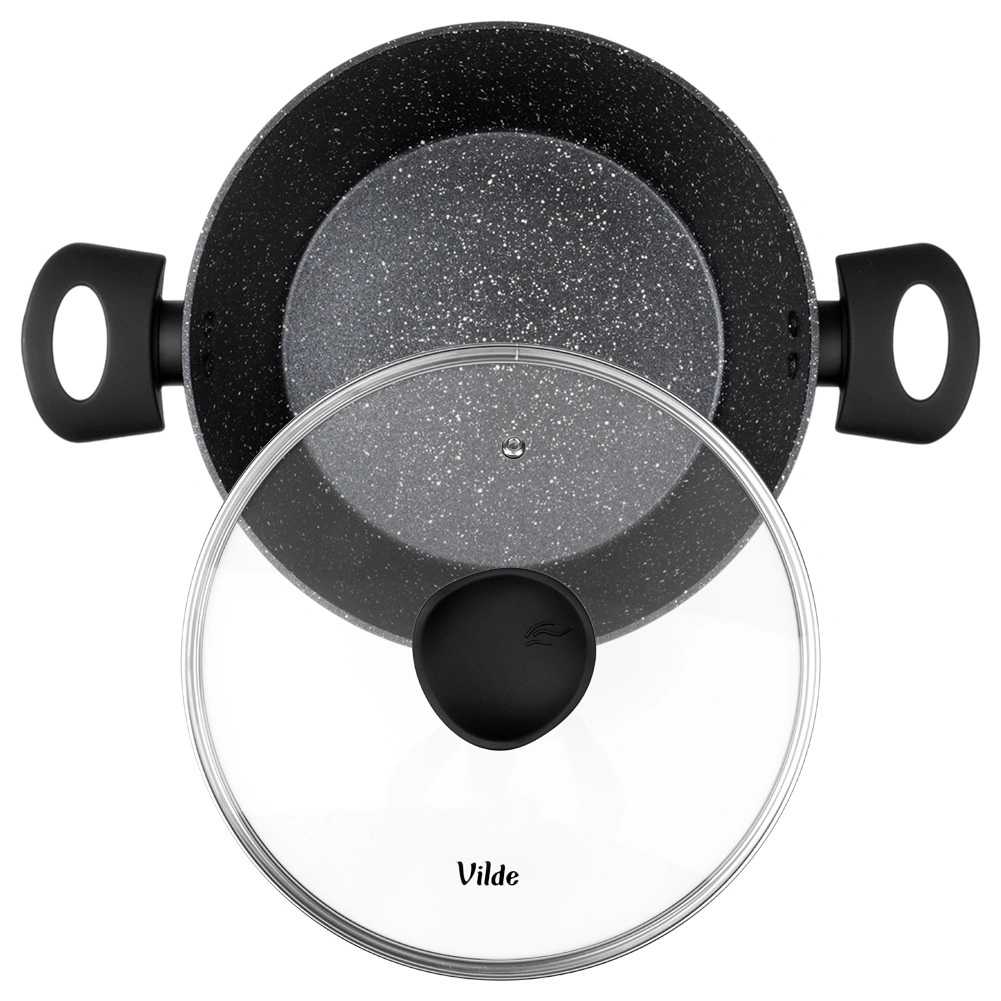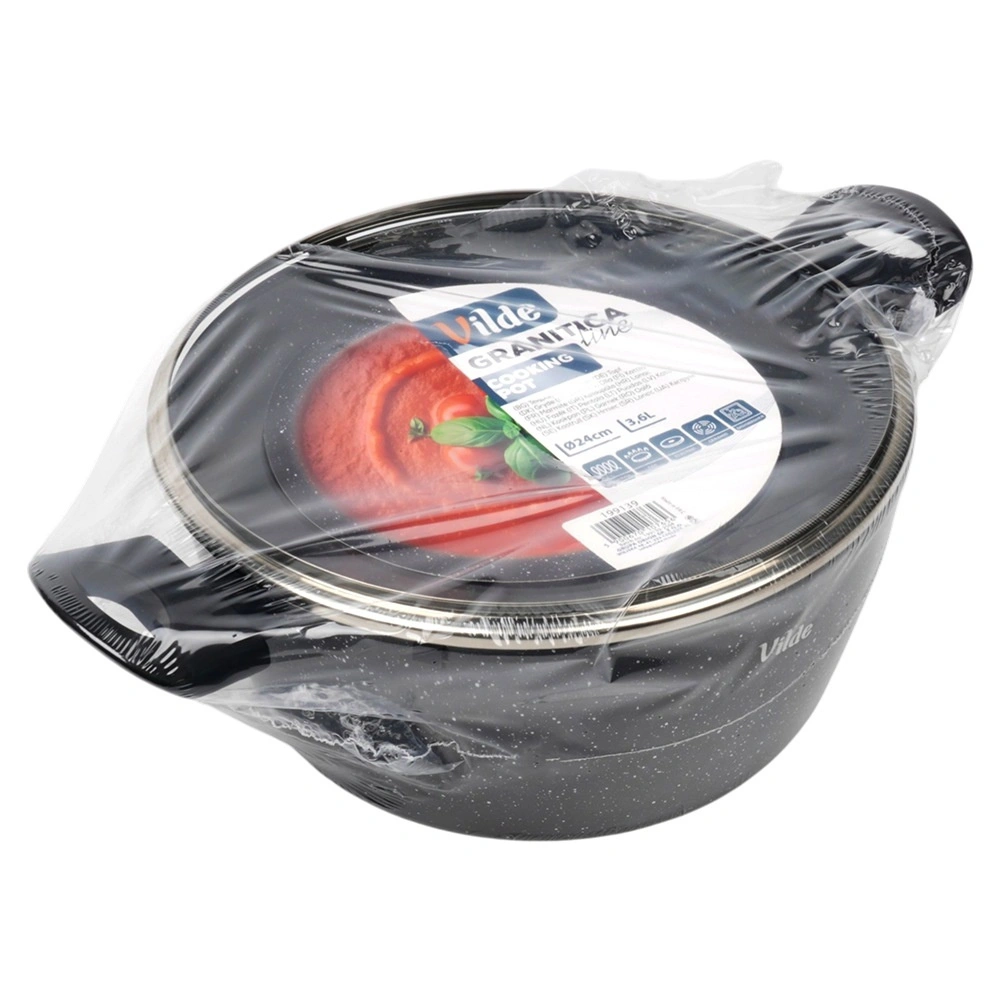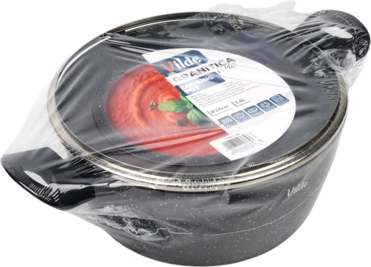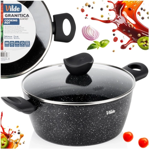Praktisk gryde med volumen 3,6 l fra serien VILDE GRANITICA kombinerer en slagfast aluminiumsstøbt krop med en nonstick granitbelægning for sund madlavning med et minimum af fedt. Inkluderer et glaslåg med dampudgang og behagelige Soft Touch-håndtag. Velegnet til induktion, gas, el og keramik og kan vaskes i opvaskemaskine.