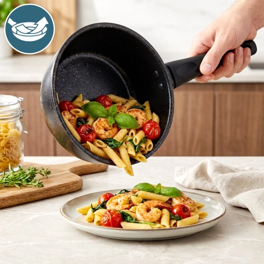 Efter madlavning skylles kasserollen blot eller sættes i opvaskemaskinen. Den glatte nonstick-overflade gør vedligeholdelsen hurtigere.