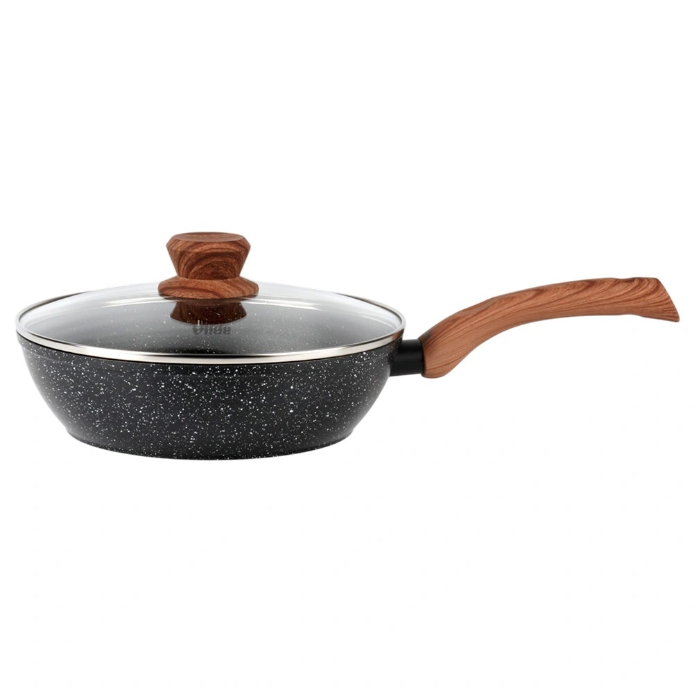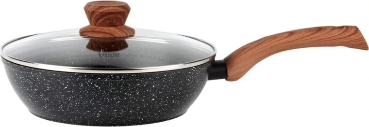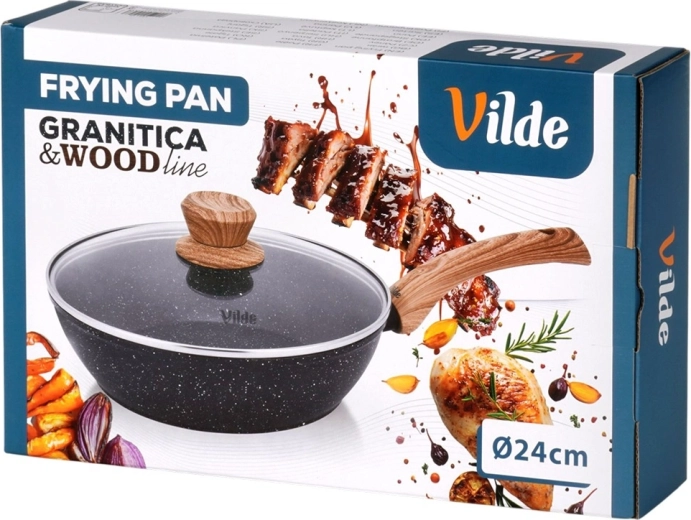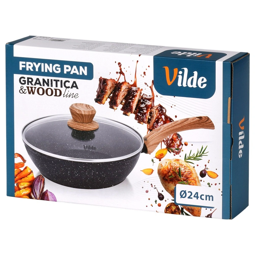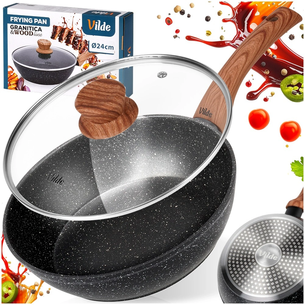 Den dybe pande GRANITICA WOOD 24 cm kombinerer en slidstærk støbt aluminiums-krop med en flerlags non-stick granitbelægning for jævn varmedistribution og nem frigivelse af maden. Glaslåg med rustfri stålkant og dampventil hjælper med at bevare varme og saftighed.