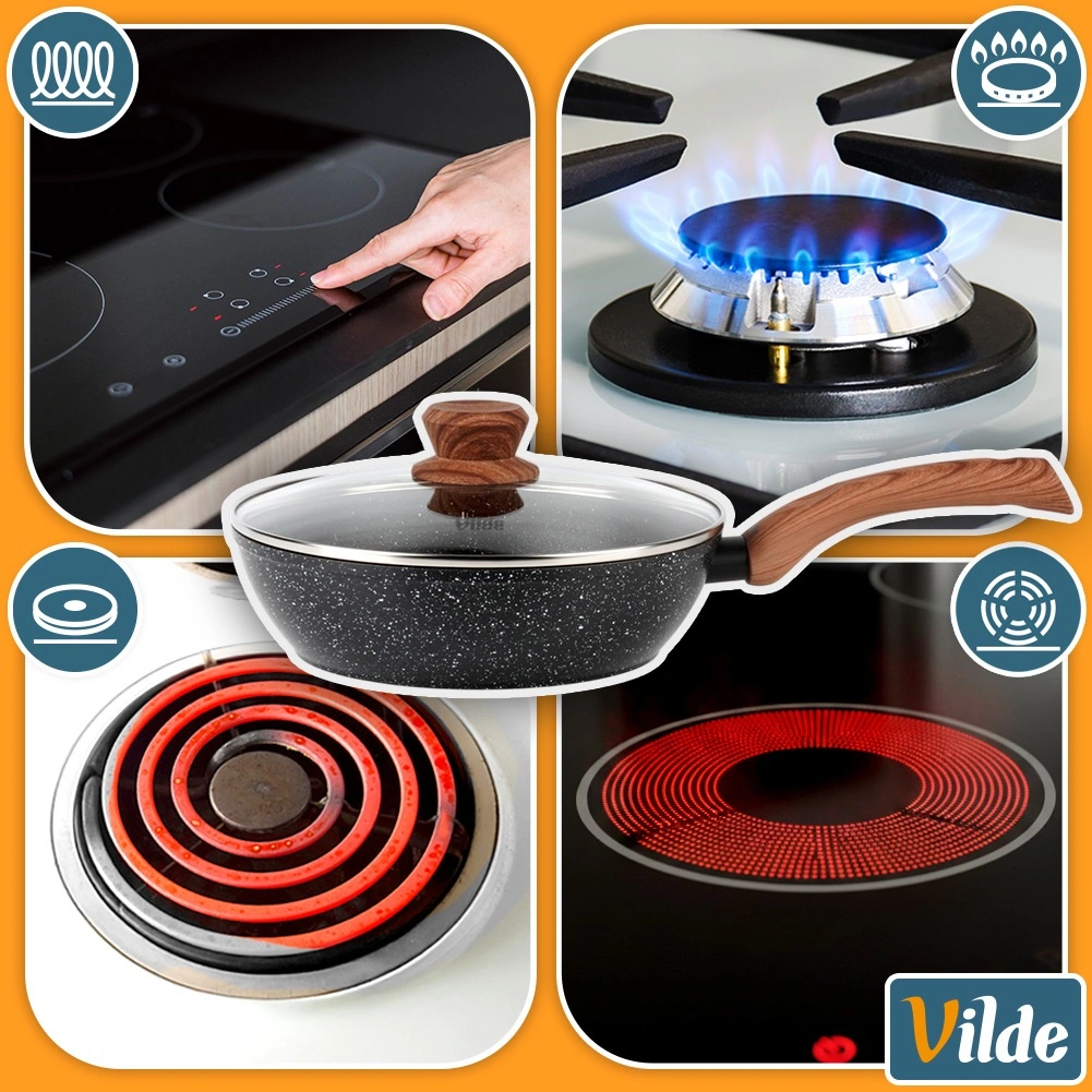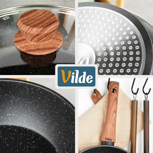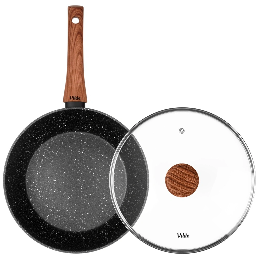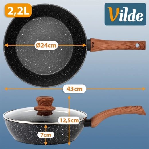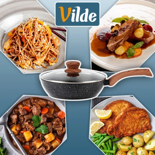 Den dybe pande GRANITICA WOOD 24 cm kombinerer en slidstærk støbt aluminiums-krop med en flerlags non-stick granitbelægning for jævn varmedistribution og nem frigivelse af maden. Glaslåg med rustfri stålkant og dampventil hjælper med at bevare varme og saftighed.