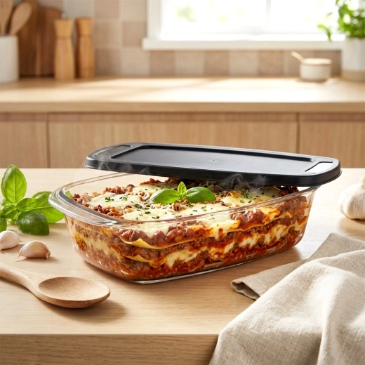 Den egner sig til lasagne, gratinerede kartofler, kød, grøntsager samt til bagning af brød, sandkage eller paté. Låget beskytter maden mod udtørring og muliggør sikker transport og opbevaring uden spild.