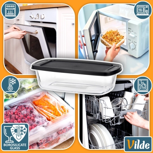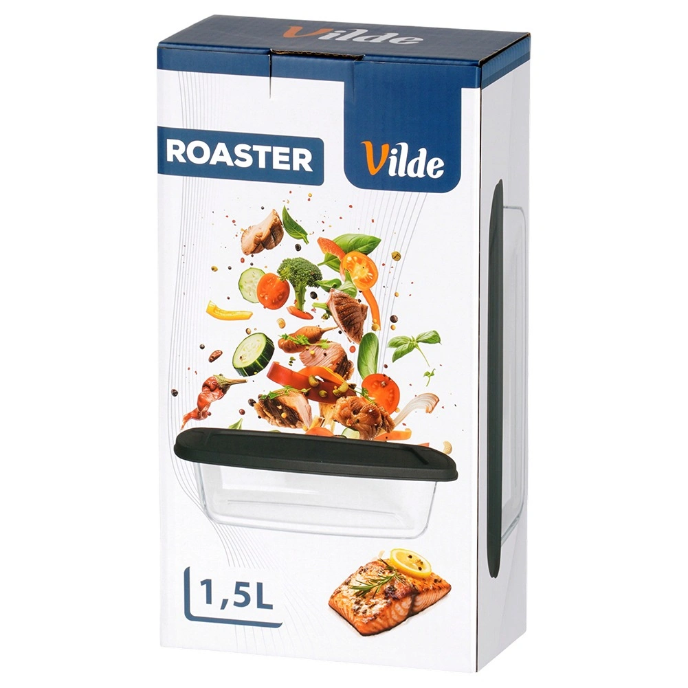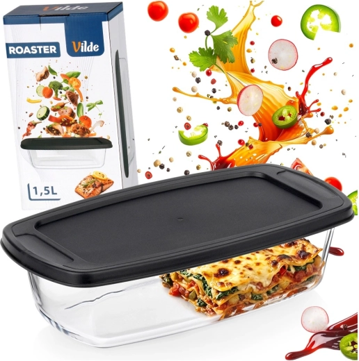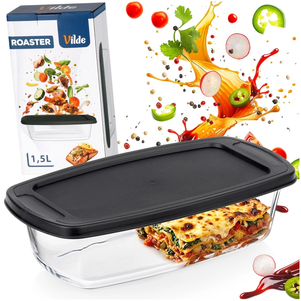 Alsidig glasskål med et volumen på 1,5 l og praktisk sort låg er ideel til bagning, gratinering og opbevaring af mad. Det holdbare borosilikatglas tåler temperaturer fra -30 °C til +400 °C (låg fra -18 °C til 120 °C), så den er perfekt til ovn, mikrobølgeovn, køleskab og fryser. Integrerede håndtag gør håndteringen nem, og det tætsluttende låg hjælper med at holde maden frisk længere.