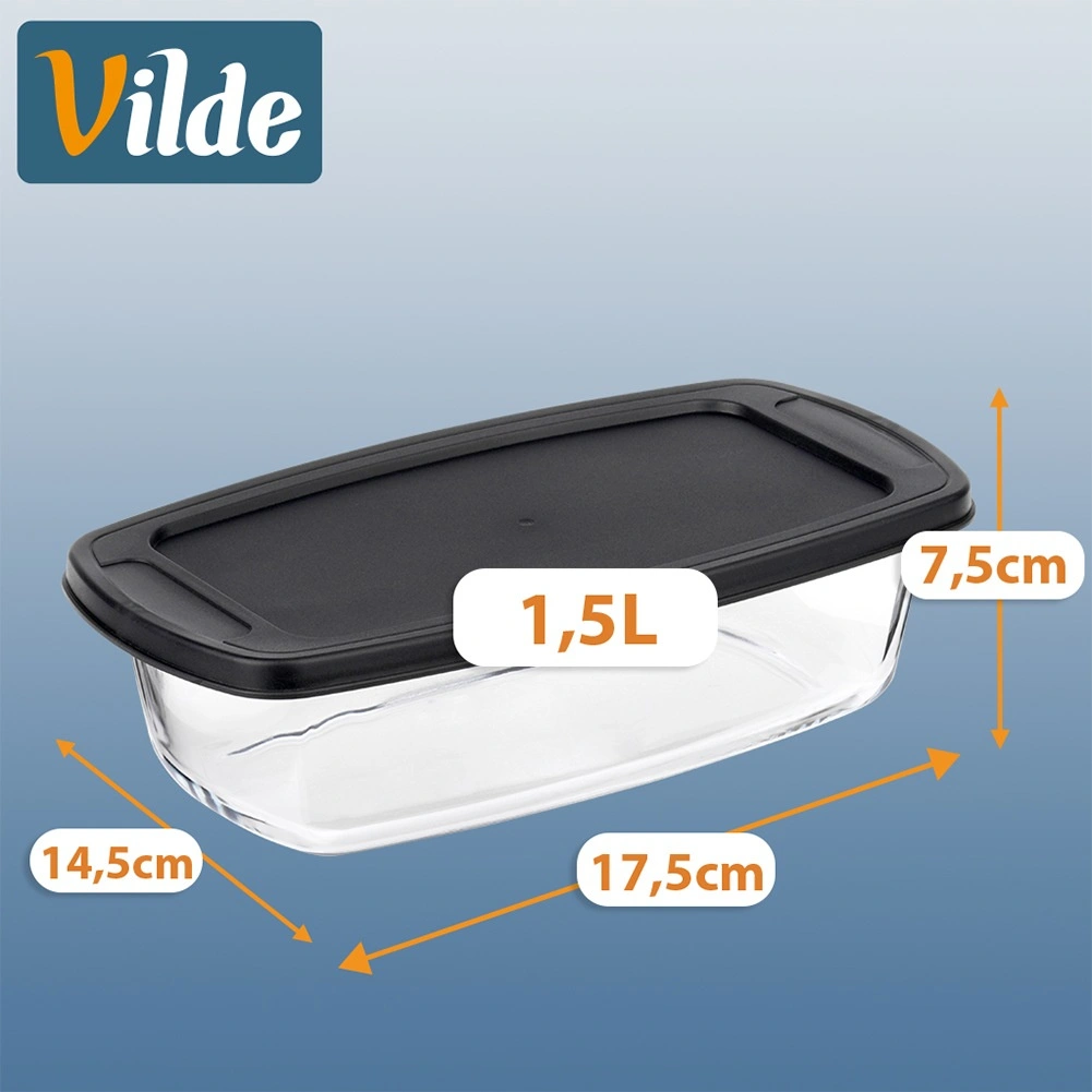 - Mål med låg: 17,5 × 14,5 × 7,5 cm; højde uden låg: 7 cm; volumen: 1,5 l