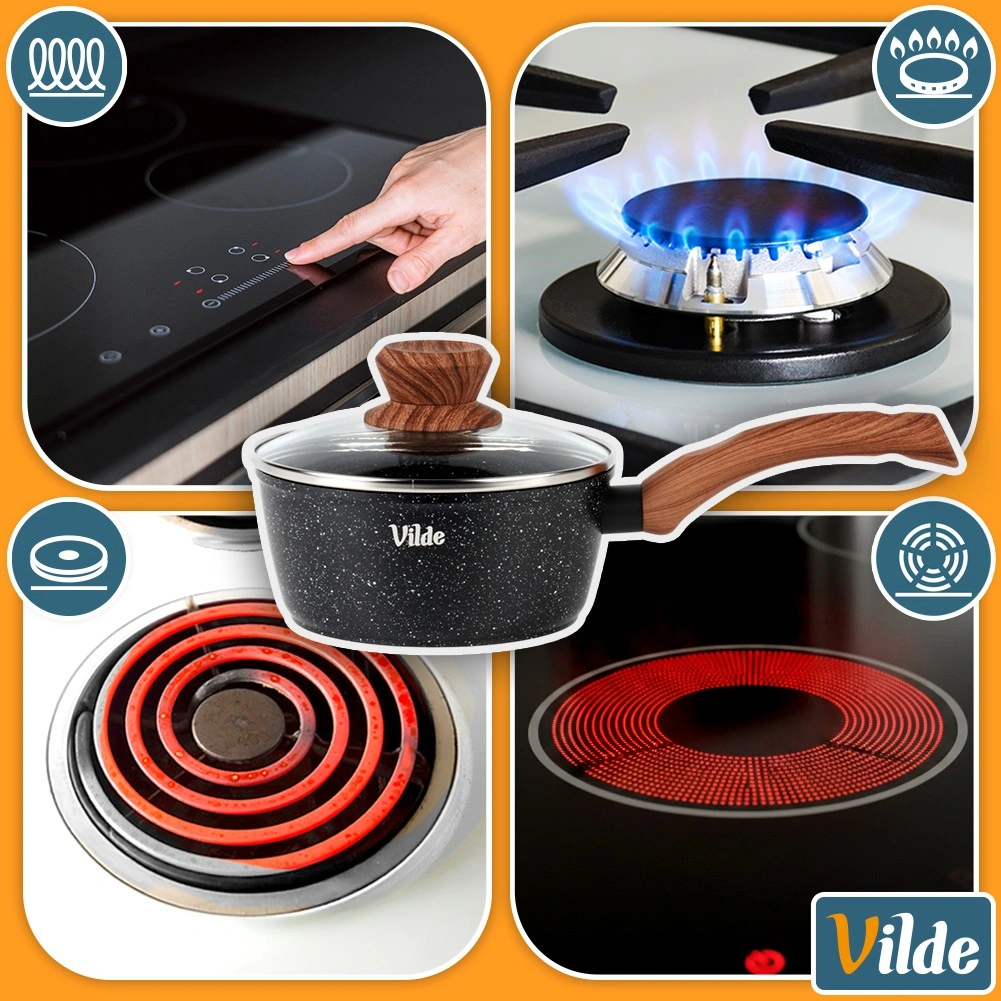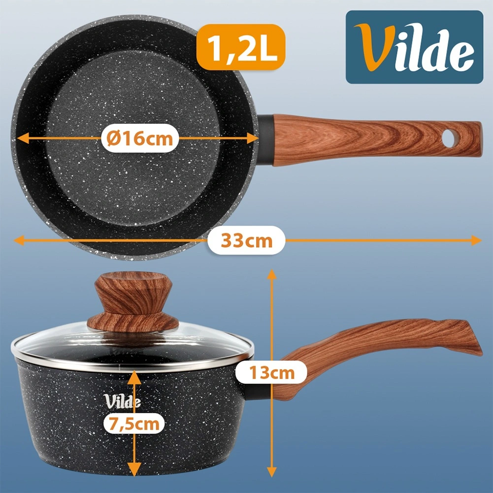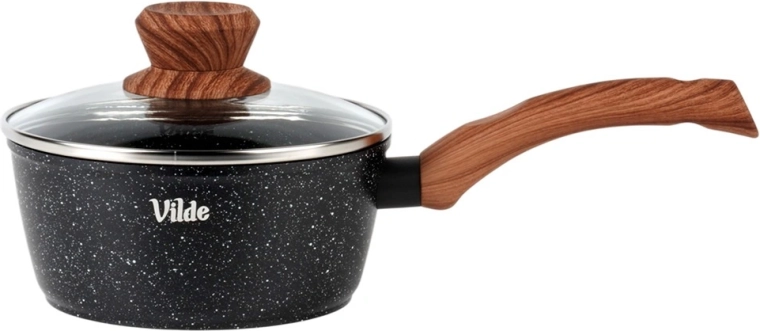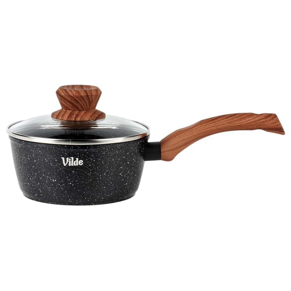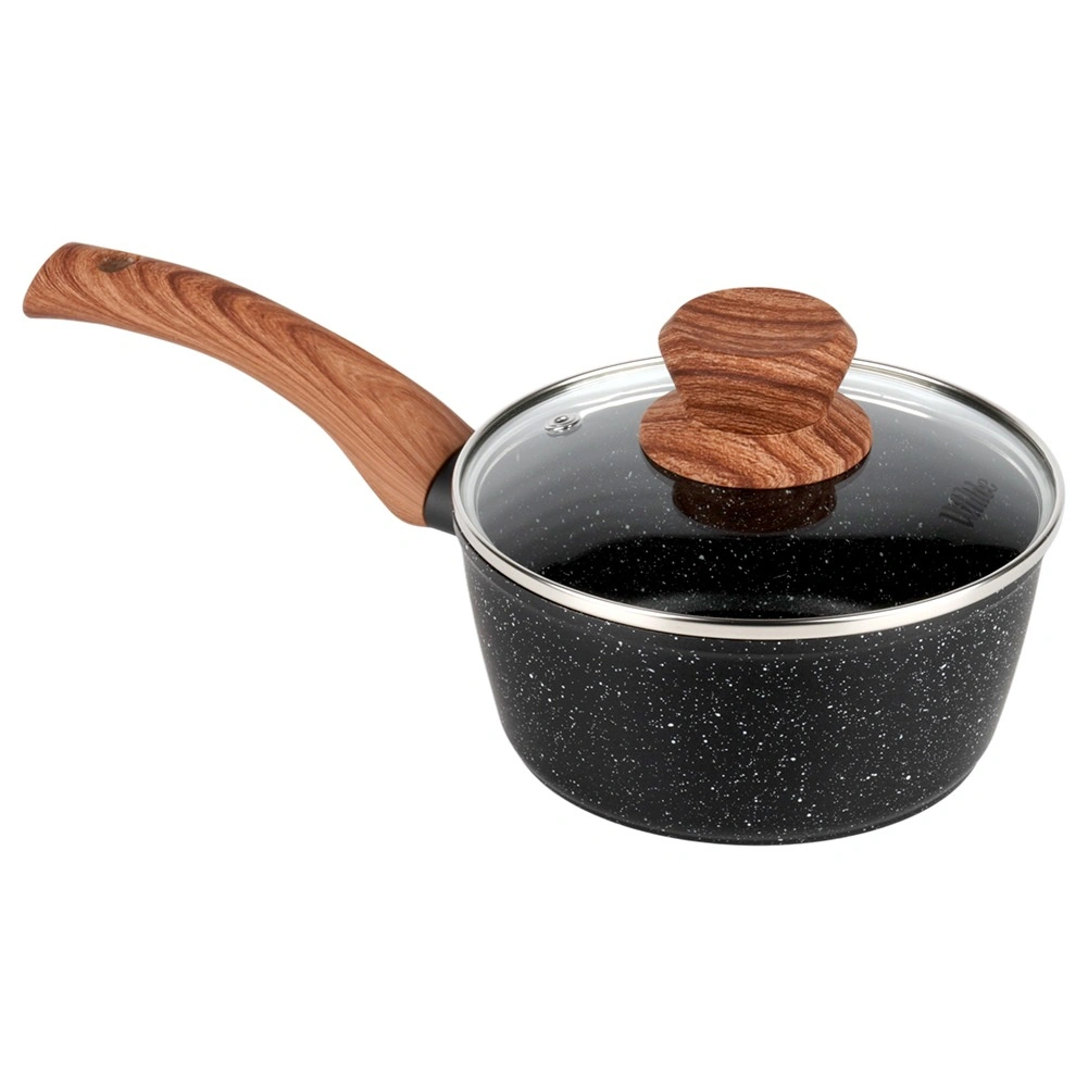 Praktisk kasserolle med en diameter på 16 cm og en kapacitet på 1,2 l, støbt i aluminium med en non-stick granitbelægning og ergonomisk soft touch-håndtag i trælook. Inkluderer glaslåg med dampventil for nem kontrol under madlavning. Velegnet til induktion, gas, el og keramiske kogeplader og kan tåle opvaskemaskine.