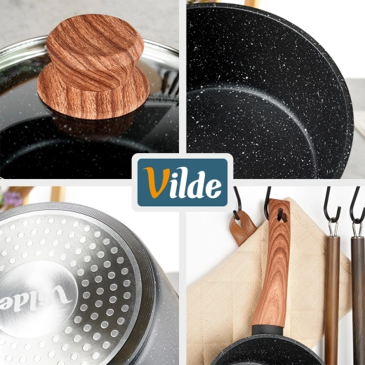 Det robuste design i støbt aluminium leder varmen effektivt, mens håndtaget med soft touch-overflade i trælook ligger sikkert i hånden. Glaslåget med rustfri stålkant og ventil gør det muligt at holde øje med processen uden at løfte låget og bevarer både fugt og smag.
