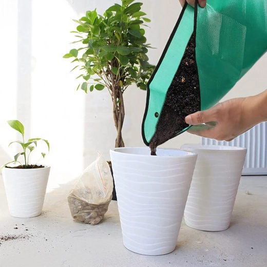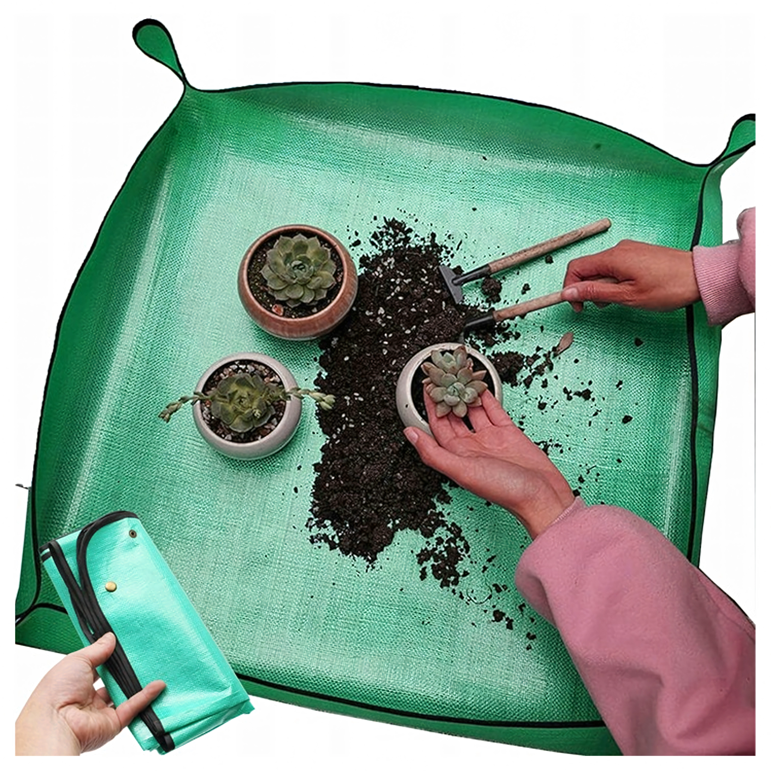 Ompotningsmåtten er designet til rent og bekvemt arbejde med planter på bord, terrasse eller vindueskarm. Trykknap-hjørnerne danner et praktisk “fad” med forhøjede kanter, der forhindrer spild af jord og opfanger vand. Efter brug tørrer eller skyller du den blot af og folder den sammen – den fylder minimalt.