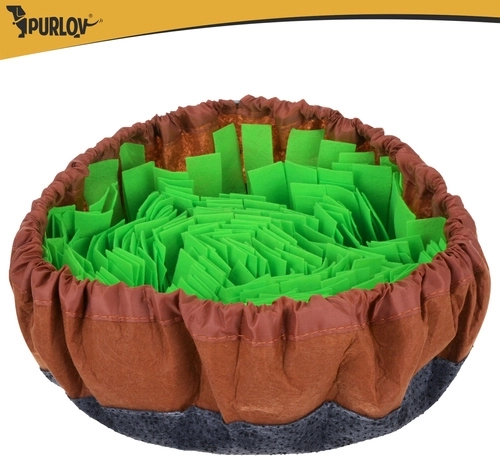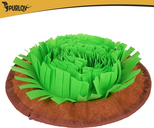 PURLOV snusemåtte gør fodringen til en meningsfuld leg. De tætte lag af bløde strimler i “græs”-look skjuler foderet, så hunden bruger sin mest naturlige instinkt – lugtesansen. Det nedsætter spisehastigheden, fremmer mental stimulering og forbedrer koncentration og ro.