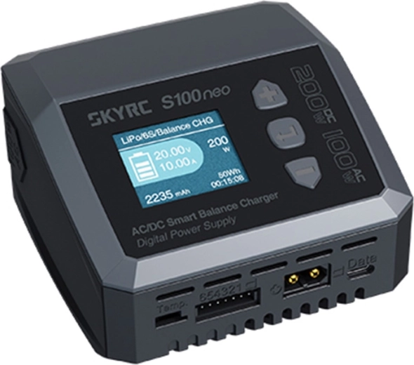 SkyRC S100neo er en smart AC/DC-oplader af ny generation til modelbyggere og teknikere, der kræver hurtig, sikker og stabil opladning. Den tilbyder 100 W fra AC og op til 200 W fra DC, præcis balancering op til 1000 mA og intuitiv betjening på en klar farveskærm. Et robust kabinet af PC‑ABS V0 sikrer lang levetid selv ved intensiv brug.