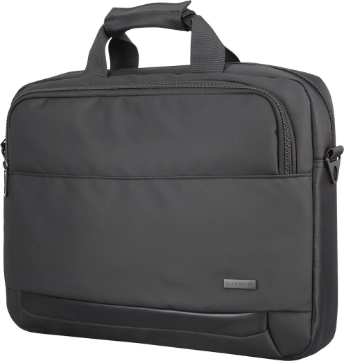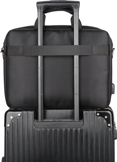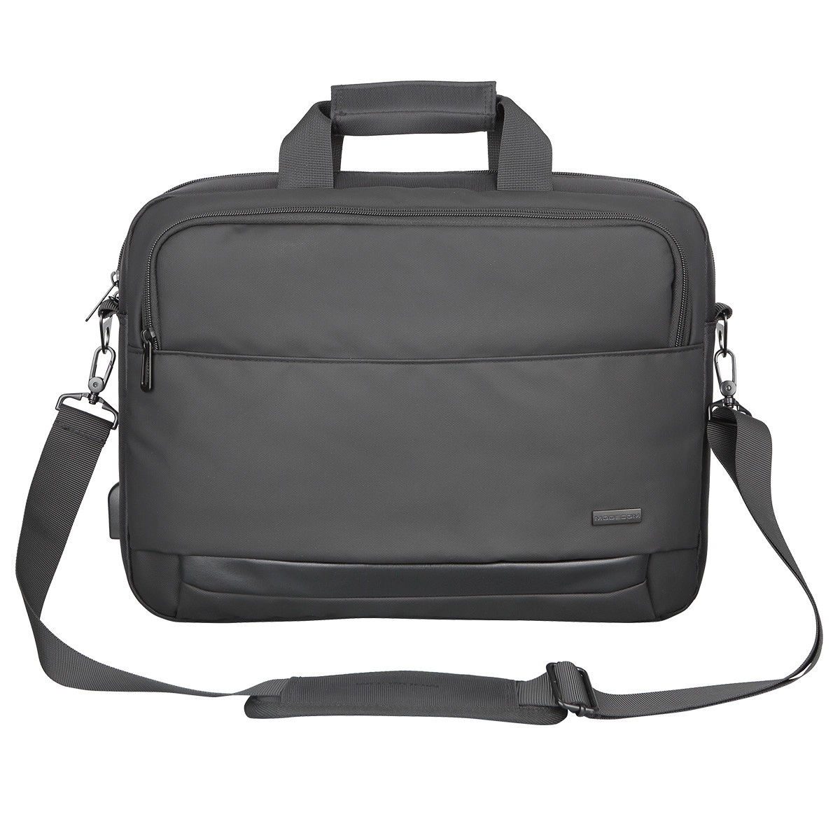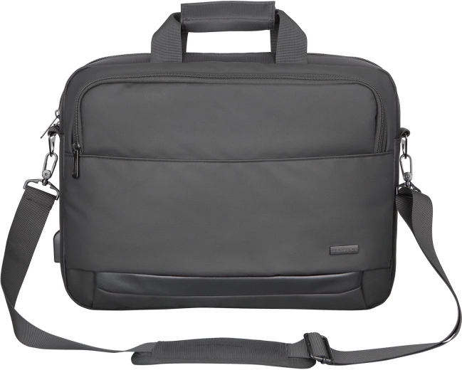 Elegant og robust taske MODECOM Porto til bærbare 15,6″ kombinerer lav vægt, forstærket konstruktion og en praktisk USB-port til opladning på farten. Den tilbyder et polstret hovedrum, behagelige polstrede håndtag med velcrolukning, en aftagelig og justerbar skulderrem samt en strop til fastgørelse på kuffert. En udvendig lomme med lynlås og vandafvisende polyester sikrer orden og beskyttelse af dine enheder og dokumenter.