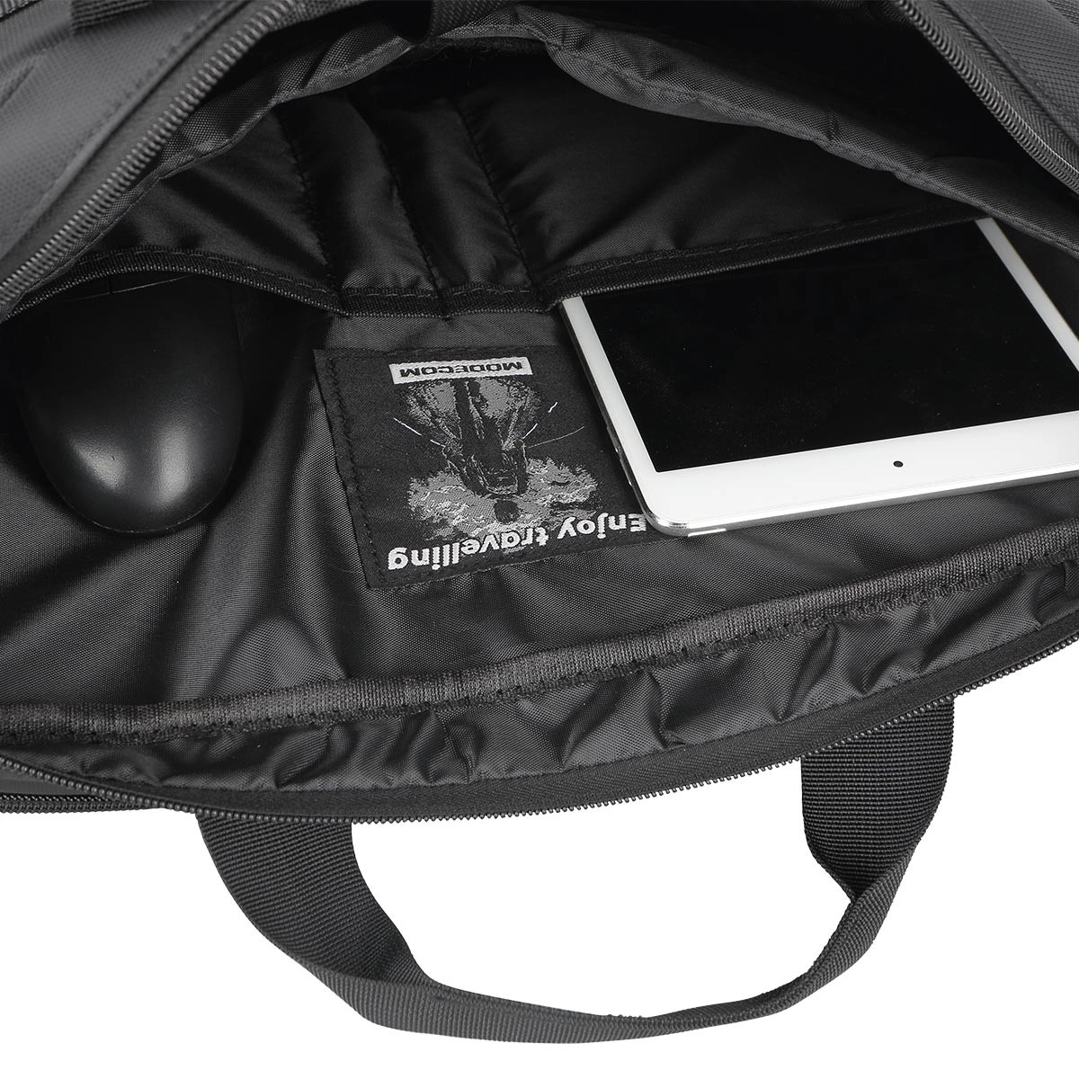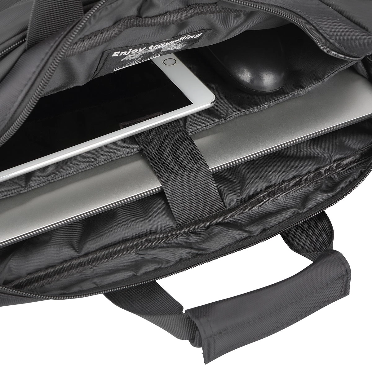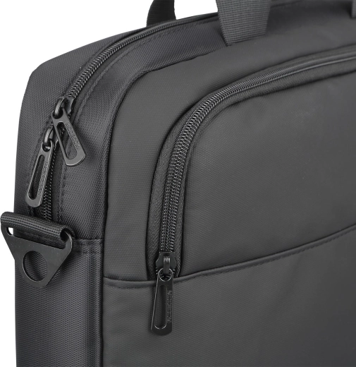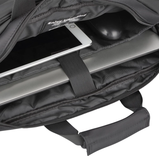 Det store hovedrum, to indvendige lommer og en frontlomme med lynlås holder tilbehøret på plads. Forstærkede sider og polstring øger sikkerheden for din enhed.