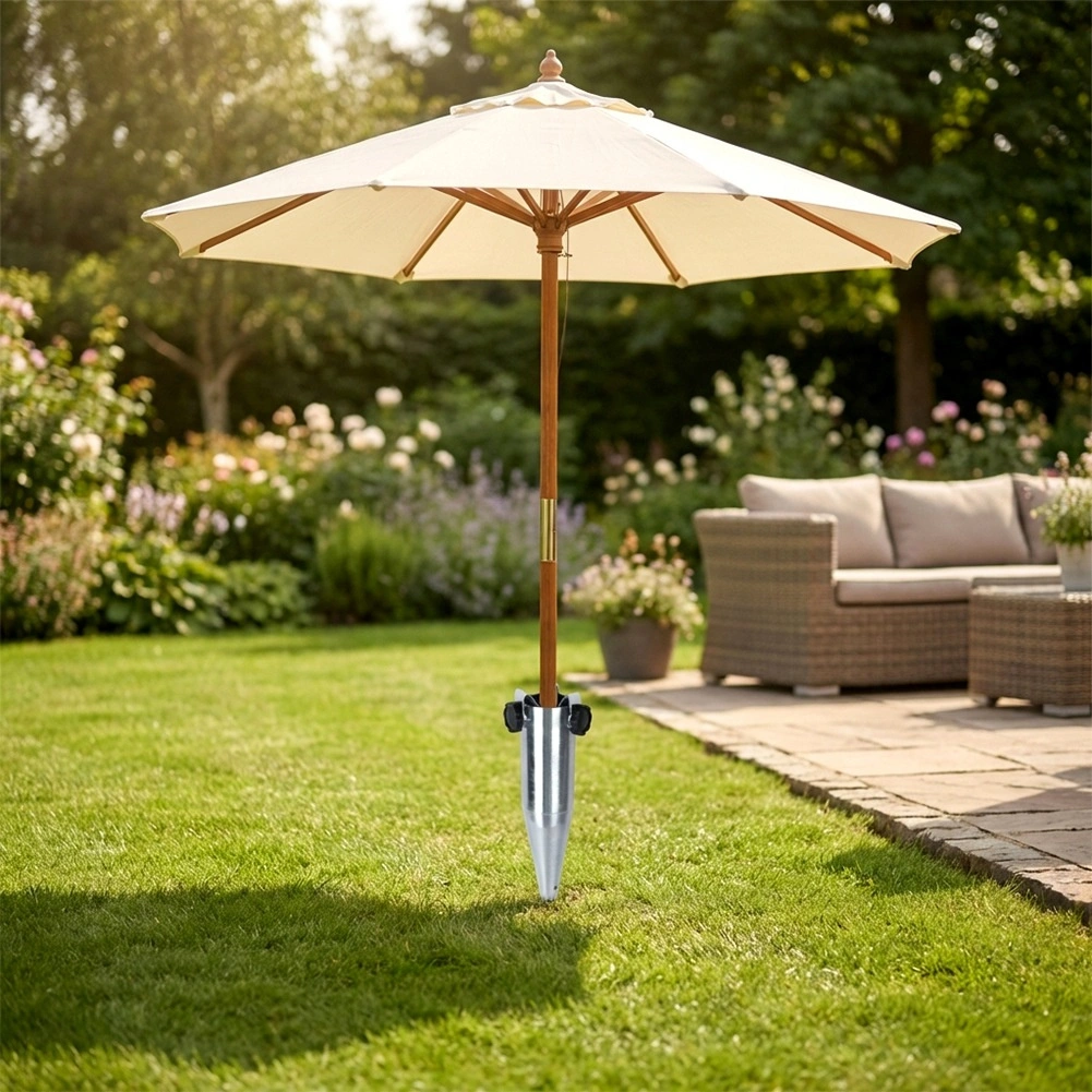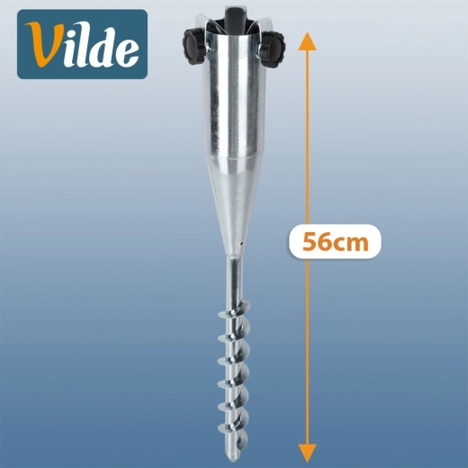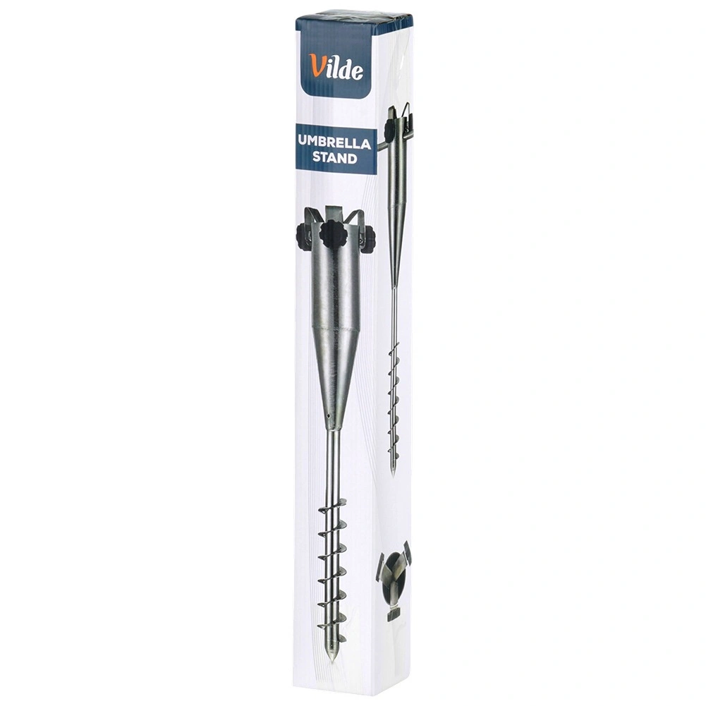 Den spiralformede gevind skruer sig fast i jord, sand eller græsplæne og holder parasollen stabil selv i vind.