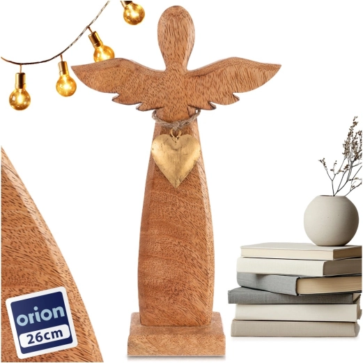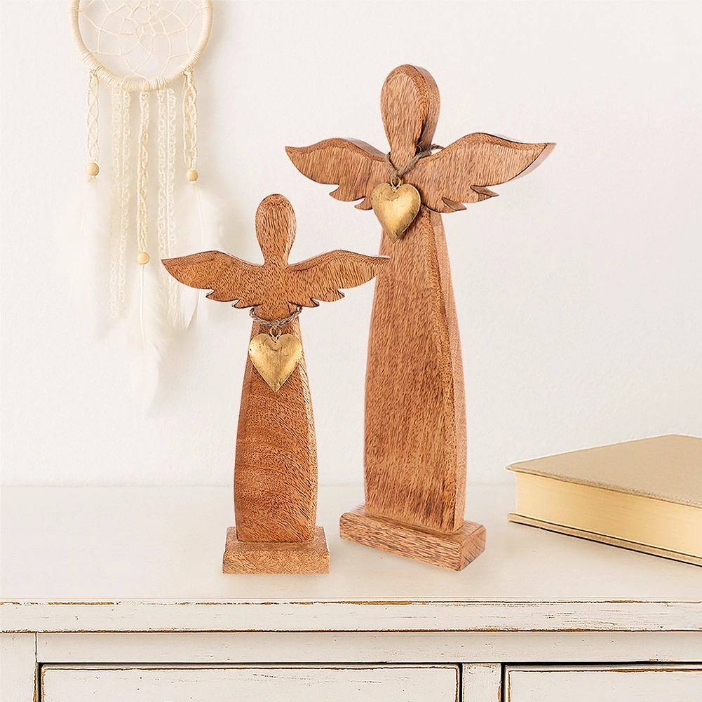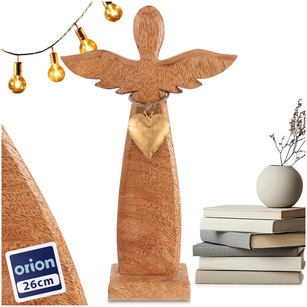 Den smagfulde engelfigur er lavet af kvalitets mangotræ i naturlige nuancer. Takket være det minimalistiske formsprog, den glatte overflade og det gyldne hjerte virker den både sart og iøjnefaldende – den passer flot i både moderne og rustik indretning.