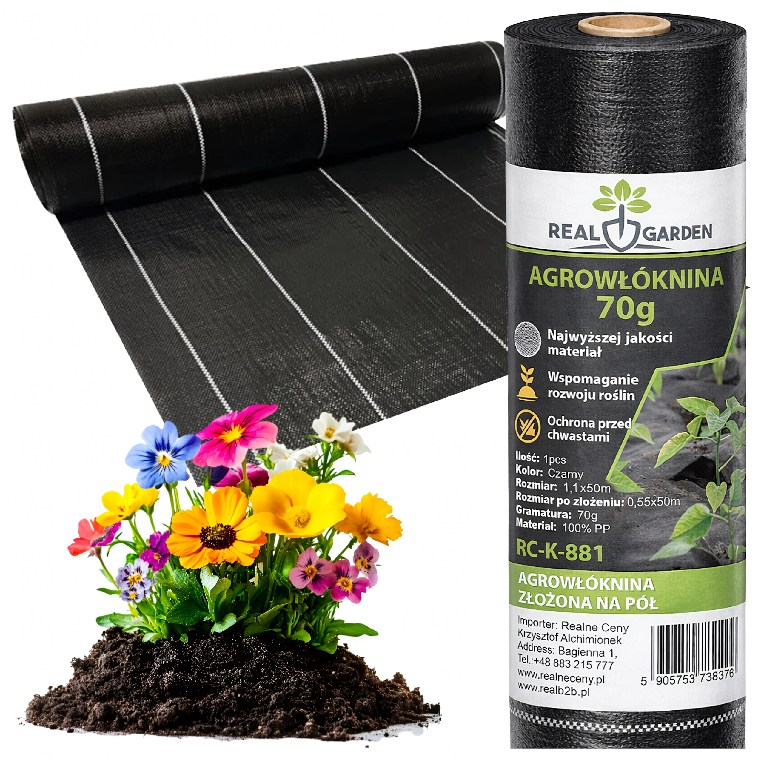 Rullen leveres foldet på midten for nemmere håndtering (bredde på den foldede rulle 55 cm, udfoldet 110 cm). Materialet er UV-stabiliseret for lang holdbarhed i solen og er rivestærkt. Velegnet under barkflis, dekorative sten og som underlag til plantebeholdere.