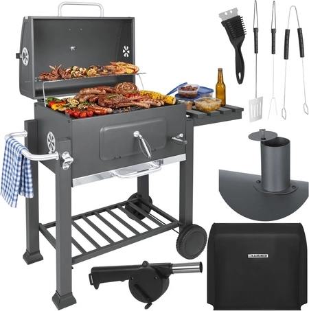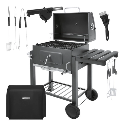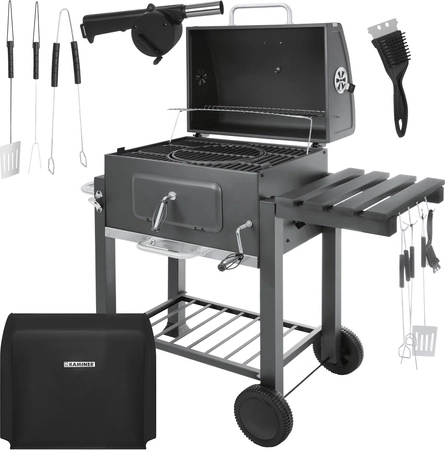 Med håndsvingmekanismen hæver eller sænker du nemt ildstedet og justerer varmen uden at flytte maden. Den rustfri kulbakke tåler højere temperaturer og rengøring, mens den udtrækkelige askeskuffe gør vedligeholdelsen hurtigere. Et praktisk sidebord, bundhylde og kroge holder udstyret lige ved hånden. I kassen finder du også et overtræk, et sæt BBQ-redskaber, en manuel blæsebælg og en rensebørste – tilsæt blot kul, og du er klar til at grille.