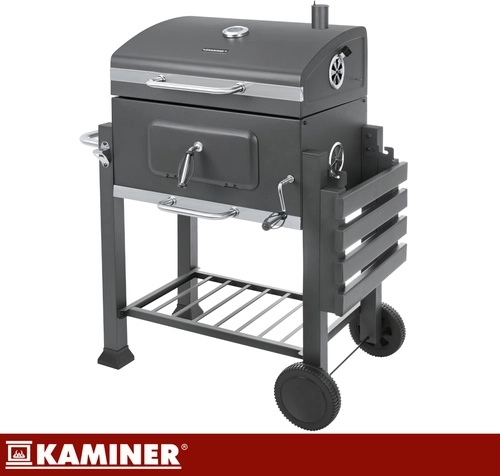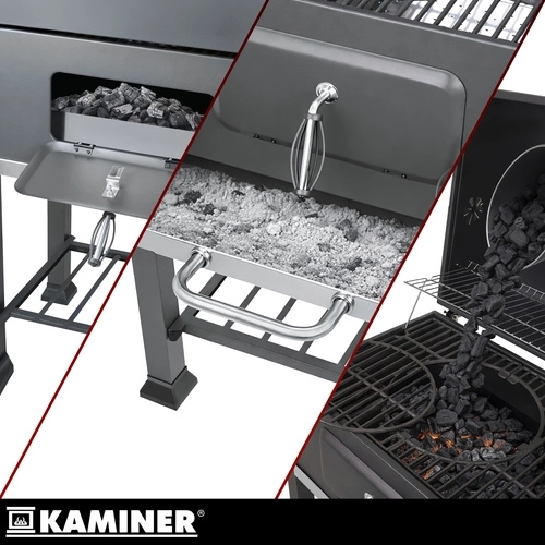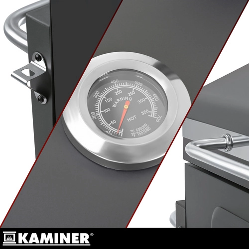 Oplev den holdbare kulgrill KAMINER, som takket være kraftig plade (1 mm) holder længere på varmen og ikke deformeres. Den støbejernsrist i 3 dele (emalje) giver sikker støtte til kødet, og det centrale hul gør betjening og rengøring lettere. Låg med integreret termometer og et system af luftkanaler med skorsten giver præcis temperaturstyring uden unødigt at løfte låget.