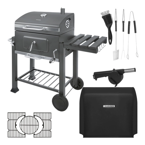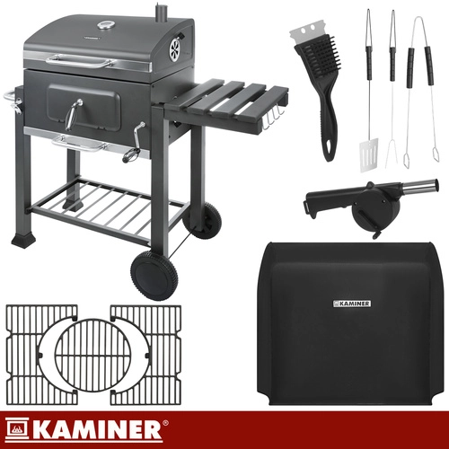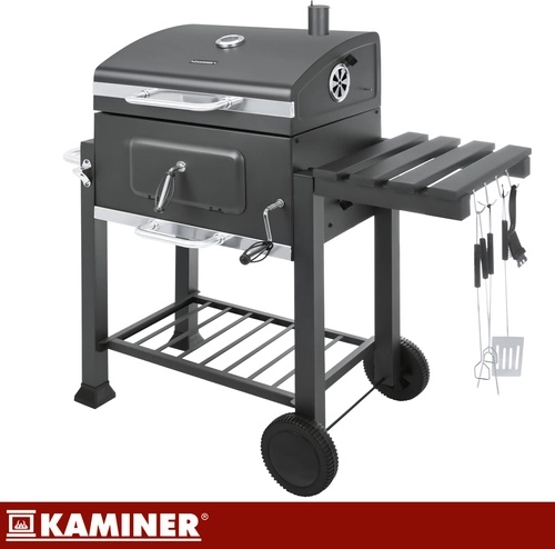 Robust havekulgrill KAMINER til krævende grillning: støbejerns, emaljeret rist i 3 dele med centralt hul, låg med termometer, højdejustering af ildsted med håndsving og rustfri kulbakke for stabil temperatur og nem rengøring. Pakken fuldendes af en forkromet øverste rist – warm rack, sidebord, askeskuffe og rigt tilbehør inklusive beskyttelsesovertræk.
