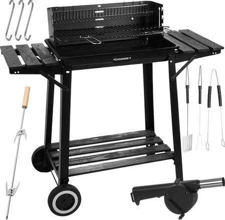 Side- og bundhylder, kroge til redskaber og to hjul sikrer et overskueligt arbejdsområde og nem flytning af grillen derhen, hvor du har brug for den.