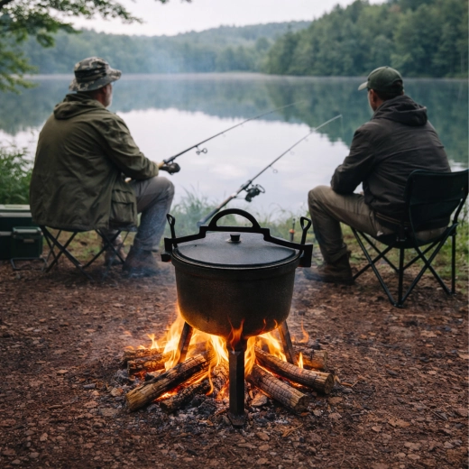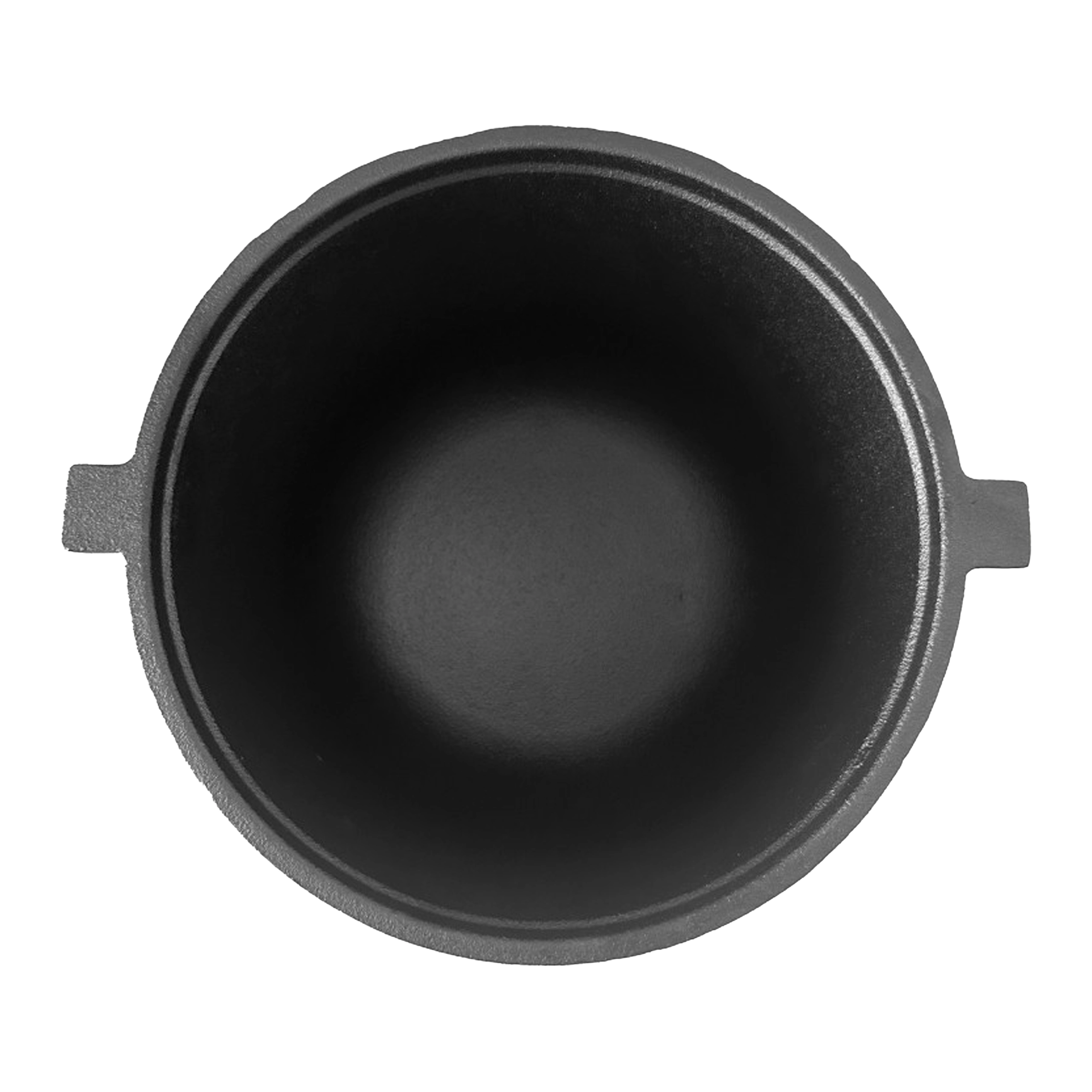 Robust støbejernskedel med et rumfang på 10 l og låg er ideel til madlavning over åben ild. Den tilbyder fremragende varmeakkumulering og jævn varmefordeling, stabil trefod til sikker placering over flammerne og en holdbar konstruktion i støbejern for lang levetid i både lejr, have og på fisketuren.