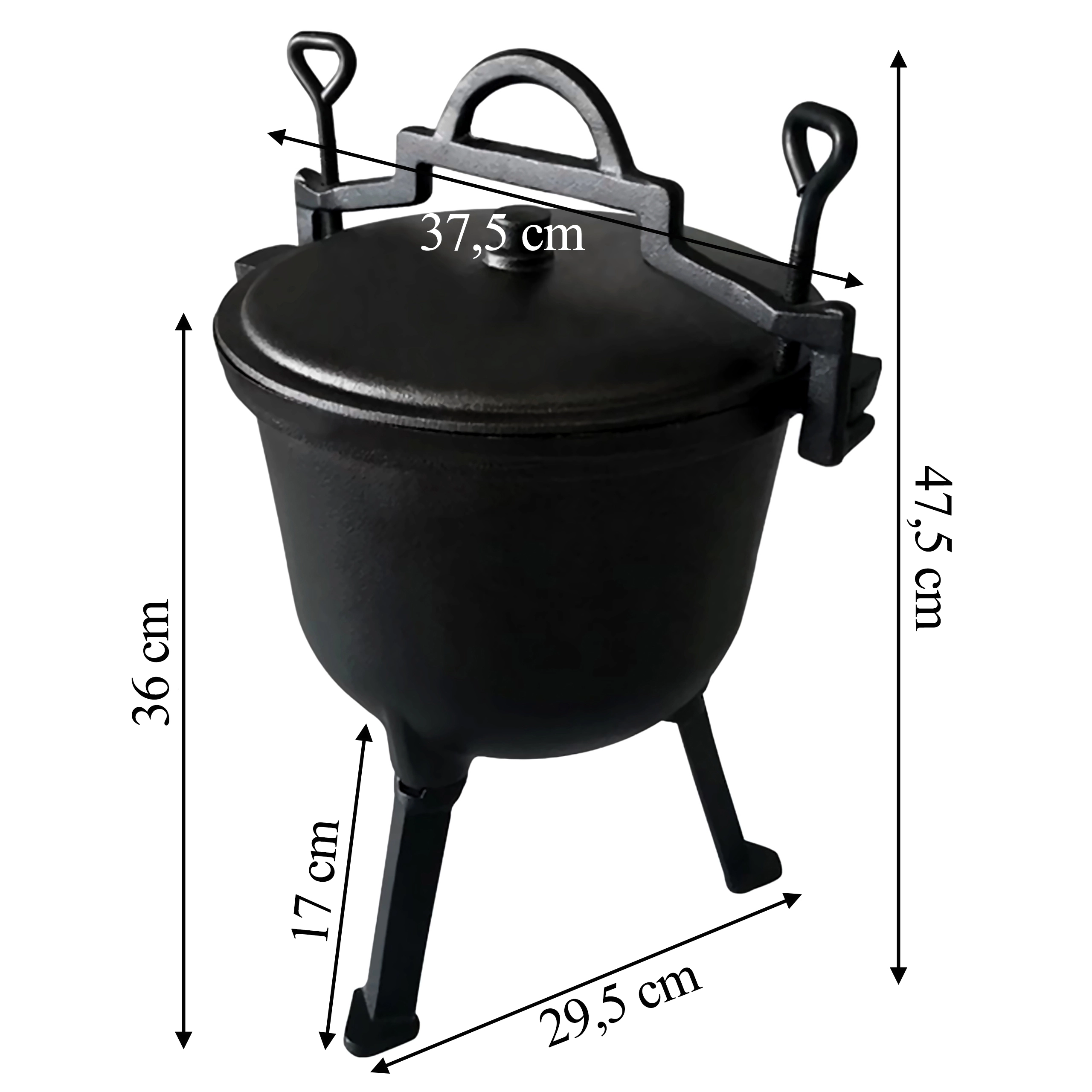 Denne støbejernskedel med låg og solide ben er perfekt til tilberedning af gullasch, supper eller varme drikke over ild. De kraftige vægge sikrer jævn opvarmning og holder på varmen længe, så maden tilberedes roligt uden at brænde på. Takket være de praktiske håndtag er den nem at bære, og låget bevarer både fugt og smag indeni.