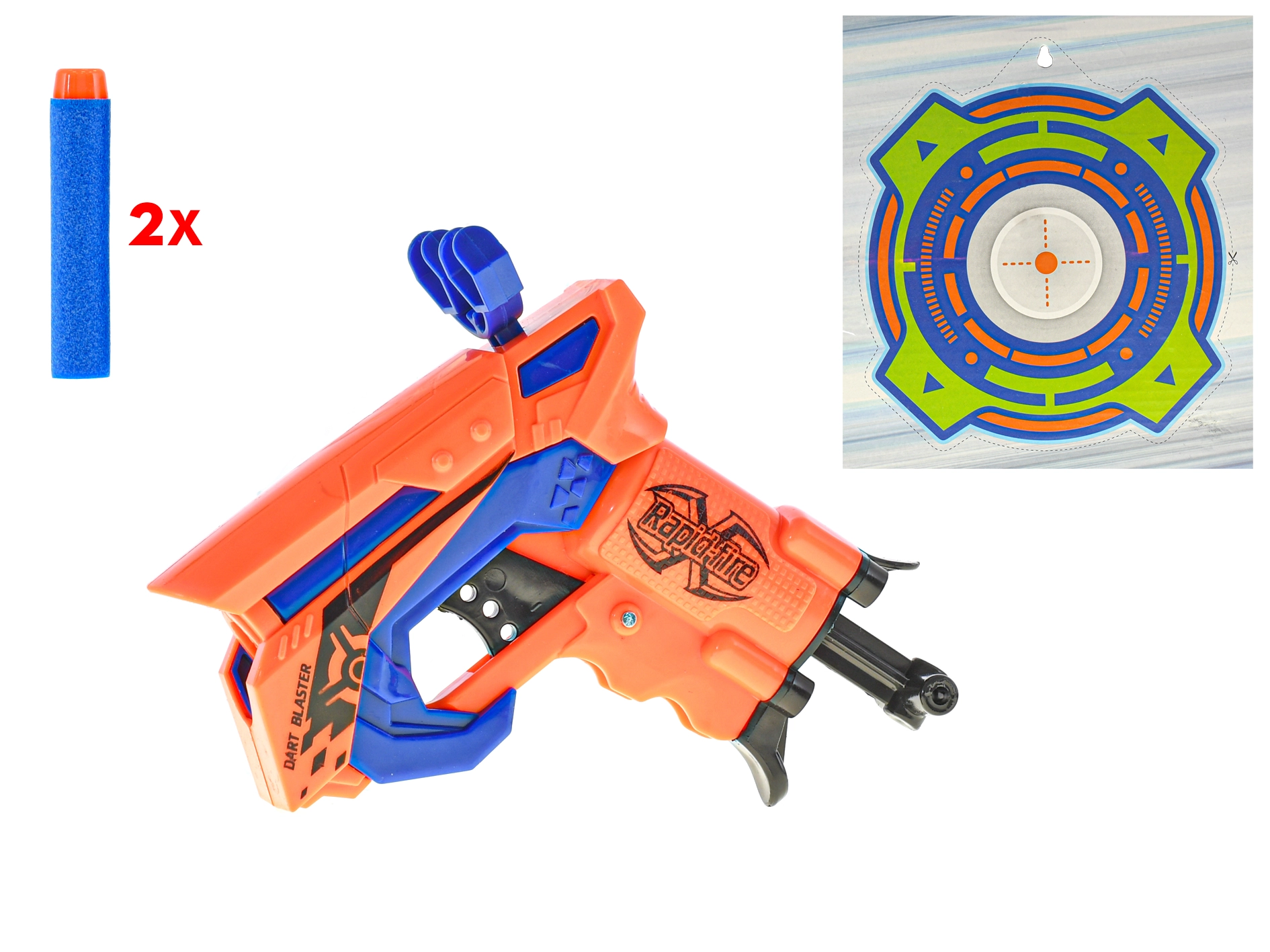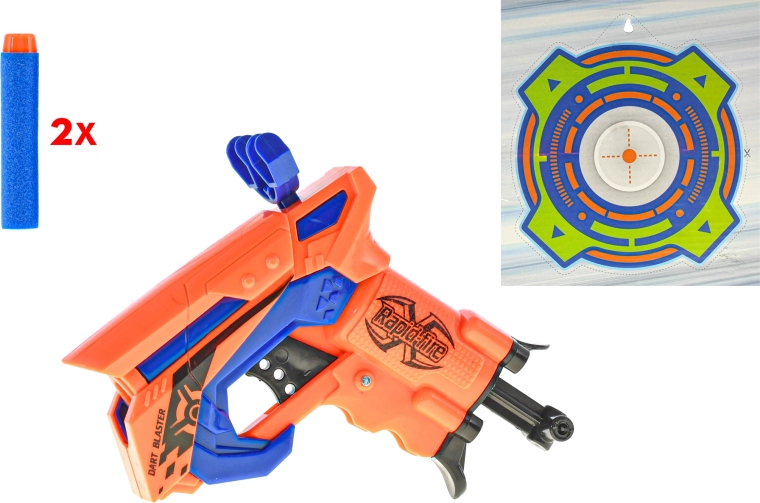 Denne lette opladningspistol er et godt valg for børn, der elsker actionlege. Takket være de sikre skumnøgler og det medfølgende mål kan små skytter trygt træne præcision og koordination. Den kompakte størrelse på 11 cm ligger godt i hånden og gør den nem at håndtere.