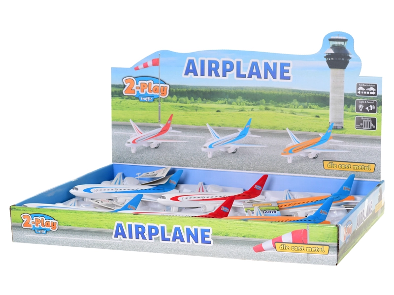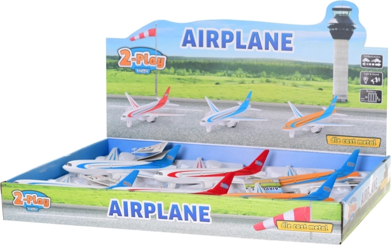 Bliv pilot og gå ombord med det metalpassagerfly fra 2-Play på 18,5 cm. Legetøjet har pull-back, realistiske lys- og lydeffekter og fås i 3 attraktive farver (blå, rød, gul). Ideelt til små flyentusiaster fra 3 år.
