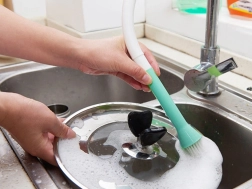 Det buede hoved med tætte børster fjerner effektivt fastbrændte rester og snavs fra gryder, pander og låg uden at beskadige overfladen.