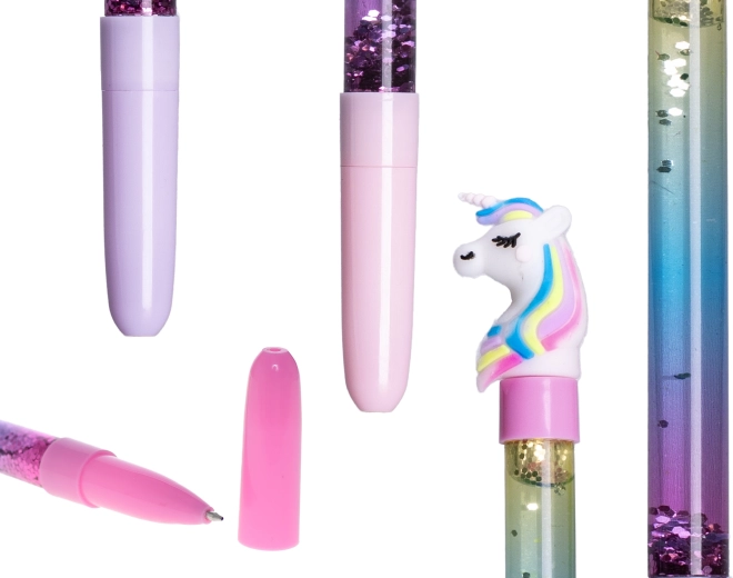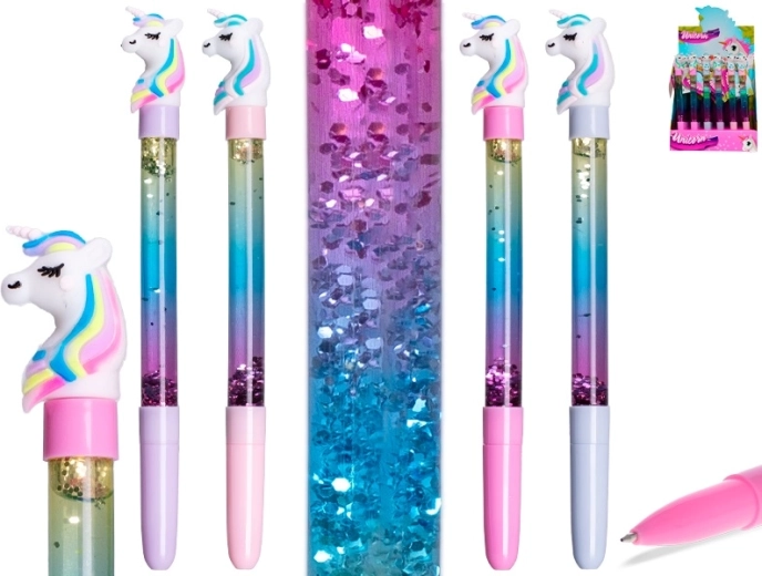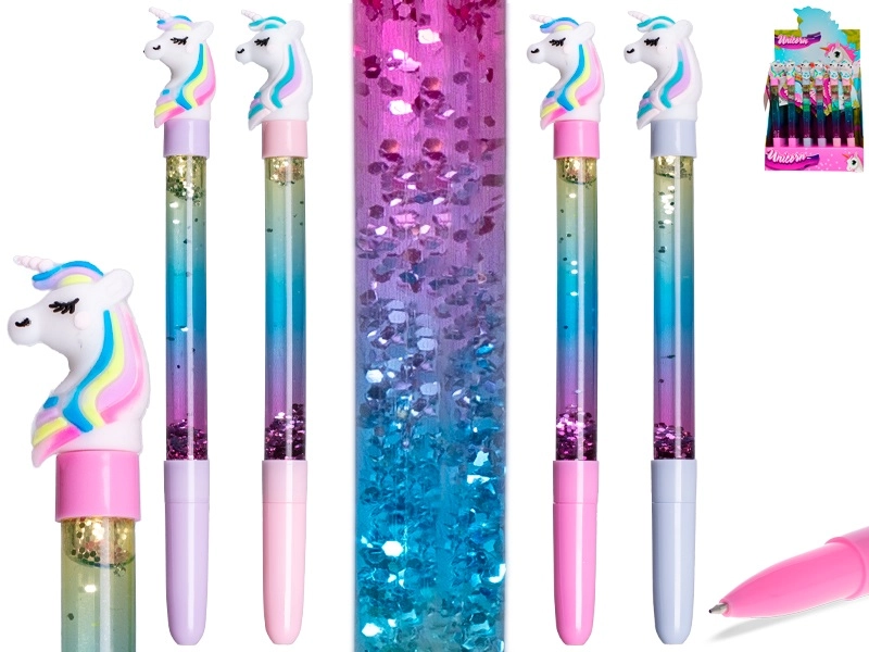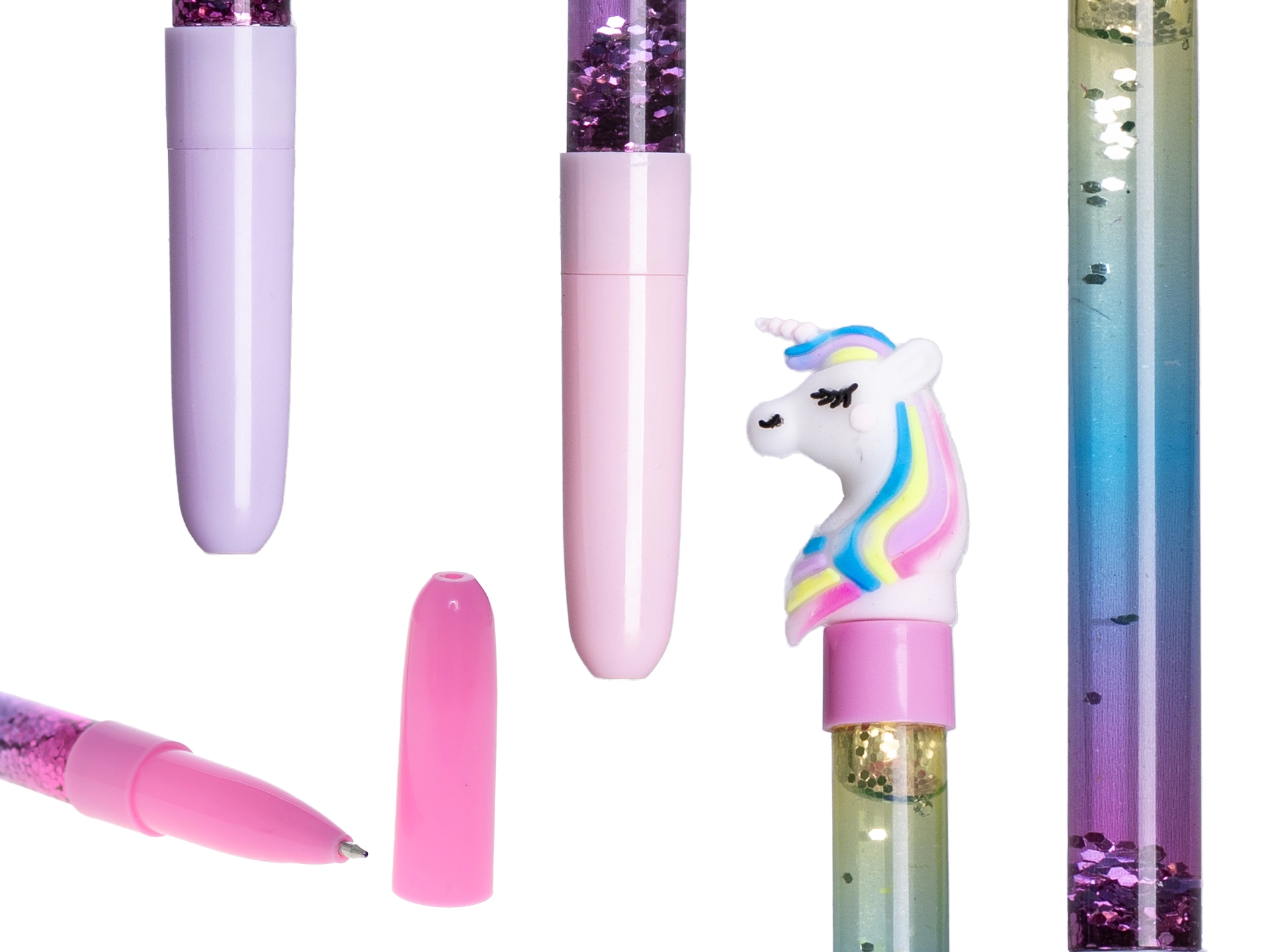 Oplev skriveglæde med denne legende kuglepen med enhjørningemotiv. Den gennemsigtige krop er fyldt med væske med glimmer, som bevæger sig under skrivning og skaber en magisk effekt. De attraktive lilla‑lyserøde og gul‑lyserøde varianter, det holdbare plast og længden på 19 cm gør denne kuglepen til et skønt tilbehør for børn fra 3 år og alle enhjørninge‑elskere.