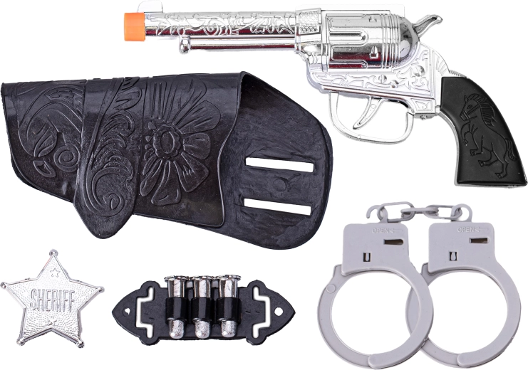 Sæt gang i børnenes fantasi med dette westernsæt til små sheriffer! Sættet indeholder en knaldpistol på 19 cm, , håndjern og en sherifstjerne – ideelt til rollelege, fastelavn og eventyr derhjemme. Takket være den lette og sikre plastkonstruktion er sættet velegnet til børn fra 3 år og er en fantastisk gave til små fans af Det Vilde Vesten.