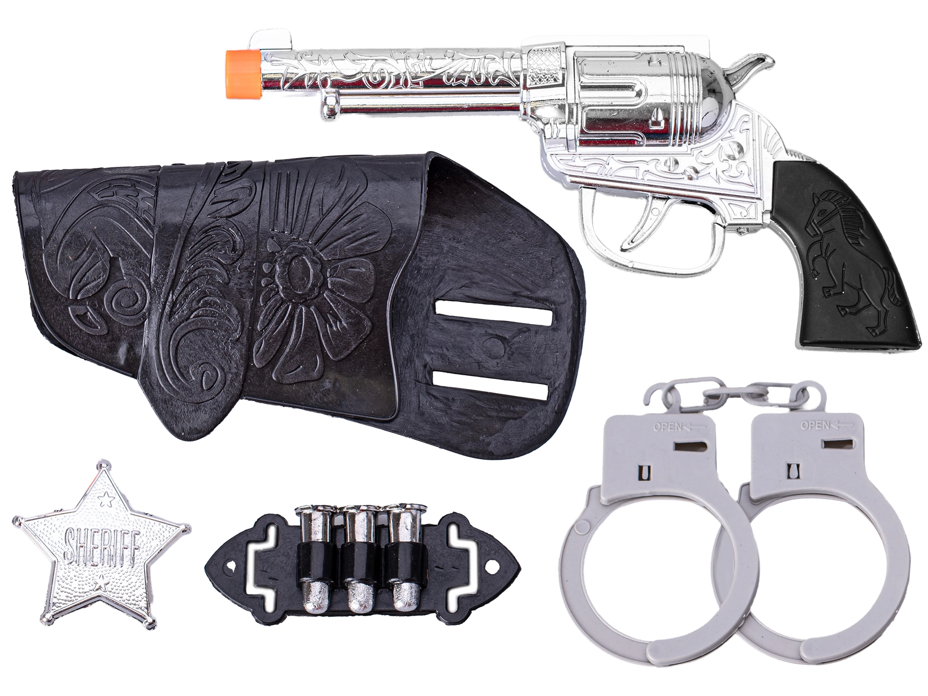 - Autentisk udstyr: pistol, hylster, håndjern og sherifstjerne for en realistisk sheriffrolle.