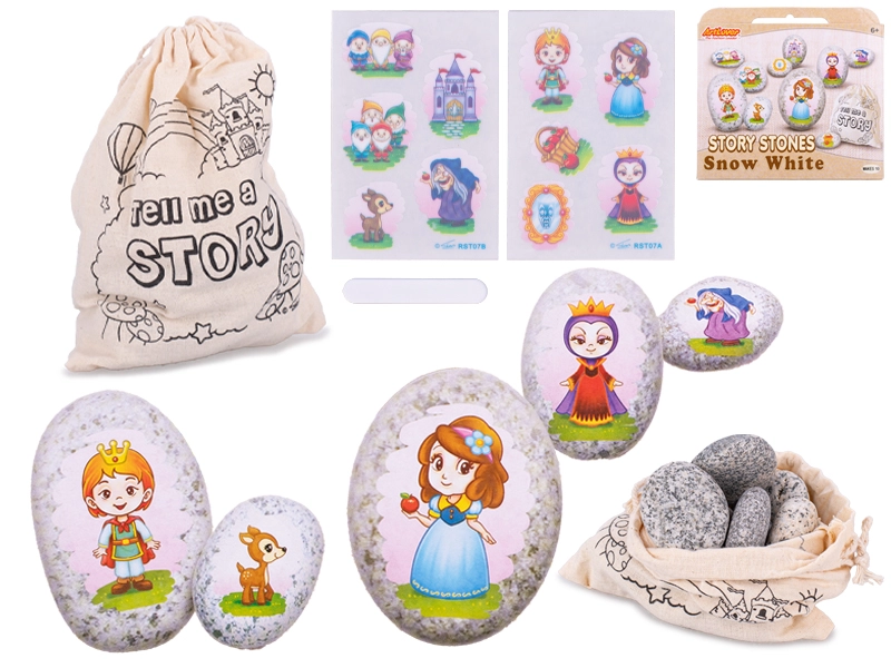 Sættet indeholder 10 nøje udvalgte naturlige sten med klistermærker med figurer og elementer fra eventyret SNEHVIDE. Børn kan genopleve deres yndlingseventyr eller skabe deres egen version – ideelt til leg derhjemme, skoleaktiviteter og på rejser.