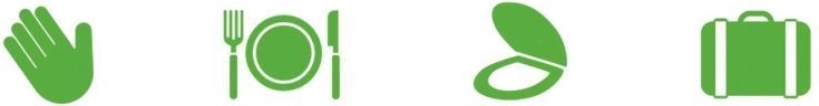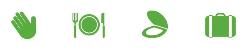 Hænder, hud, mund; før/efter mad, efter toilet, på rejser