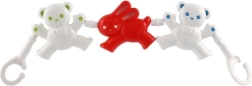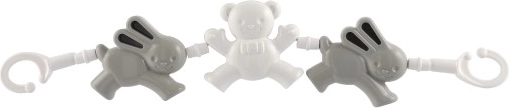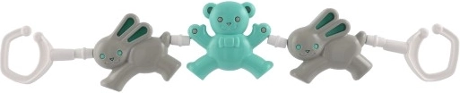 Barnevognskæden med bamser og kanin er et ideelt tilbehør til at underholde dit barn. Takket være de forskellige former og klare farver hjælper den med at udvikle finmotorik og dit barns sanser. Nem fastgørelse med kroge i begge ender gør det hurtigt og enkelt at sætte den på barnevogn eller tremmeseng.