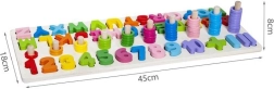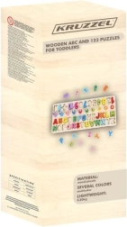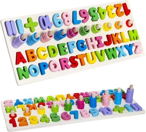 Denne multifunktionelle træpuslespilsløsning kombinerer sjov og læring i ét. Mens de leger, lærer børn formerne på bogstaver og cifre at kende, benævner dem, bygger de første enkle ord og træner tællefærdigheder med ringe på pindene. De levende farver motiverer til opdagelse og styrker kreativitet og koncentration.