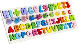Udtagelige træbrikker af bogstaver og cifre med matchende former på brættet gør det nemt at genkende former, benævne dem og danne de første ord samt lave enkel taltræning.