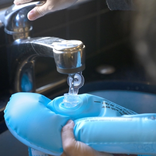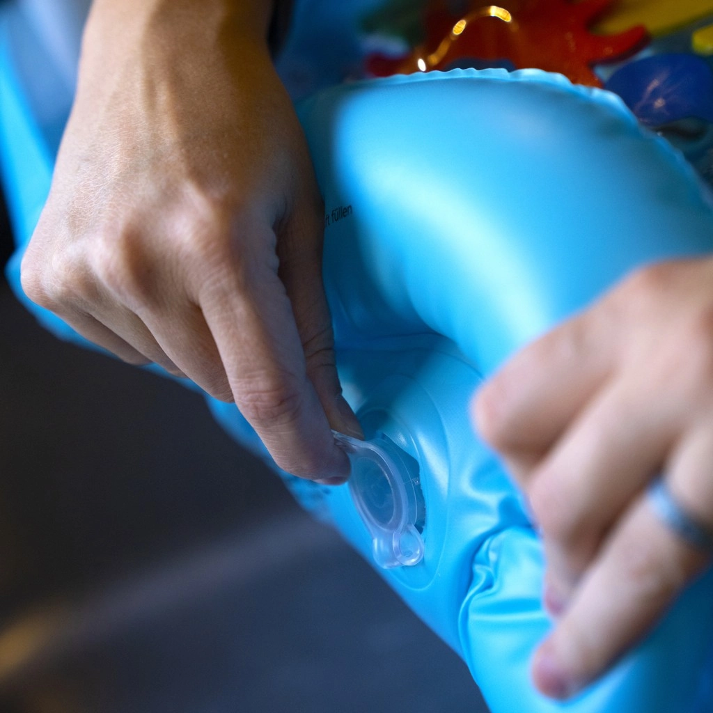 Det praktiske design gør hverdagsbrug let: Vandkammeret fyldes på et øjeblik, kanten pustes op for blød polstring, og efter leg tømmes vandet igen. Den glatte overflade er let at rengøre, tæppet kan foldes til kompakte mål og tages med overalt – på besøg, ferie eller i stuen.