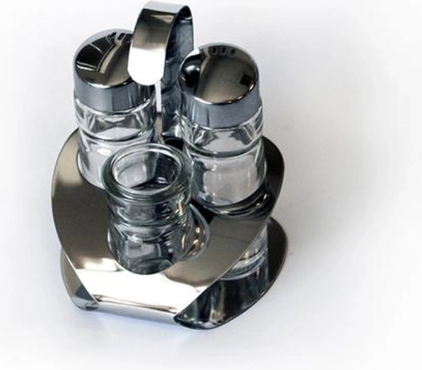 Stilfuldt kryddesæt af klart glas i en holder af rustfrit stål til daglig brug. Indeholder en saltbøsse, peberbøsse og en beholder til tandstikker, nem at bære, med let vedligeholdelse og mulighed for opvask i maskine. Det elegante design gør det til et fremragende gaveidé.