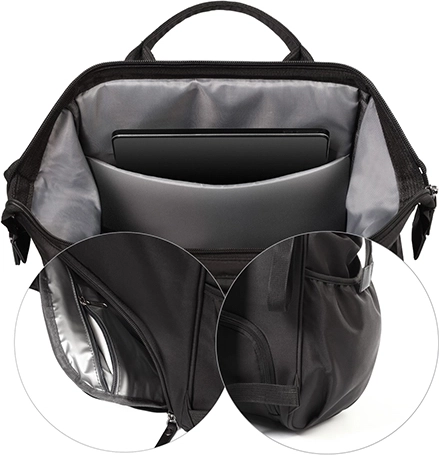 Hold styr på tingene med et sæt lommer, herunder en isolerende flaskeholder, en vandtæt pose til våde ting og et rum til tablet eller bærbar. Hurtig adgang sikres af en tovejslynlås og en frontlomme.