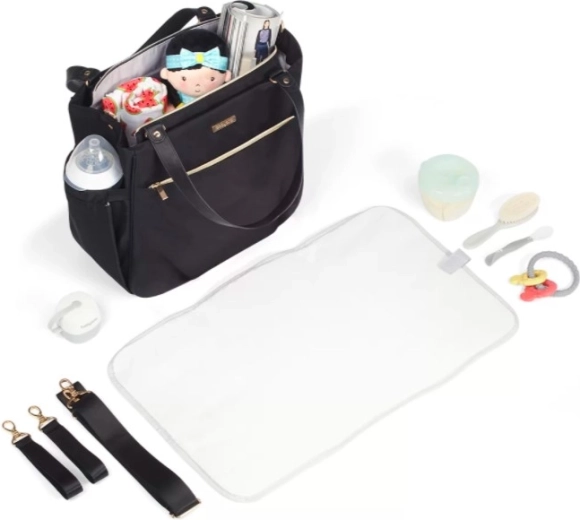 Det robuste og holdbare materiale med glat overflade er let at rengøre og modstår kravene ved daglig brug og skiftende vejrforhold. Komfortable hanke, aftagelig skulderrem og side-stropper til montering på barnevogn giver maksimal fleksibilitet ved bæring. Der medfølger også en praktisk puslemåtte til nem pleje på farten.