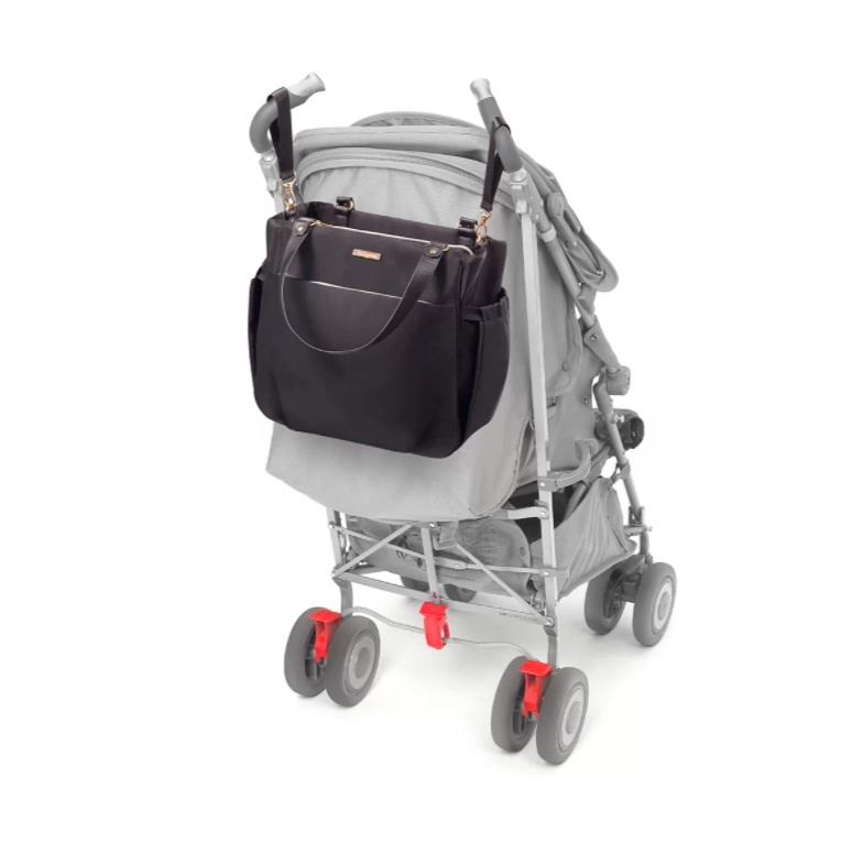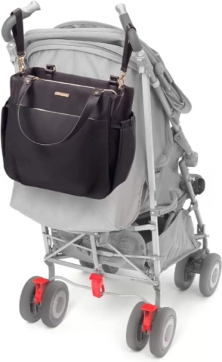 Komfortable hanke, aftagelig skulderrem og side-stropper til nem fastgørelse på barnevogn giver maksimal fleksibilitet og frie hænder.