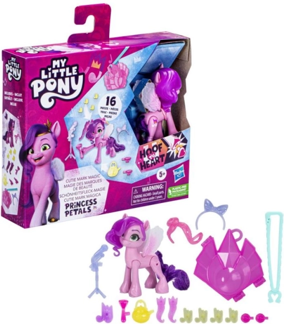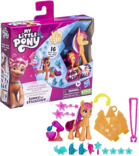 Oplev magien i My Little Pony-universet med det legende Magisk Cutie Mark-sæt! I pakken finder du en yndig 8 cm pony med poserbare led, en enhedsnøglering til at sætte fast vedhæng og tilbehør samt indsættelige Cutie Marks, der giver ponyerne deres unikke kraft. Takket være funktionen “Hov-til-hjerte” og muligheden for at pynte manken med hårsmykke-vedhæng får børn masser af fantasifuld leg både hjemme og på farten.