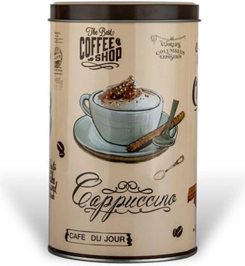 Denne runde blikdåse i elegant retrostil giver dit køkken karakter og holder samtidig madvarerne friske i længere tid. “Café du Jour”-designet vil glæde både kaffelskere og alle, der sætter pris på praktiske og dekorative accessories.