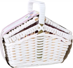 Den hvide flettekurv tilbyder opbevaringsplads til hele sættet, mens dens stærke konstruktion og dekorative elementer giver en autentisk picnickfølelse.