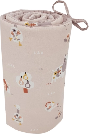 Den praktiske fastgørelse med snore gør det let og stabilt at montere i de fleste standardtremmesenge. Målet 180 × 35 cm dækker den lange side og en del af den korte side af tremmesengen, eller tre kortere sektioner efter behov. Den blide pudderrosa nuance og My Farm-motiverne passer smukt til andet udstyr i børneværelset.